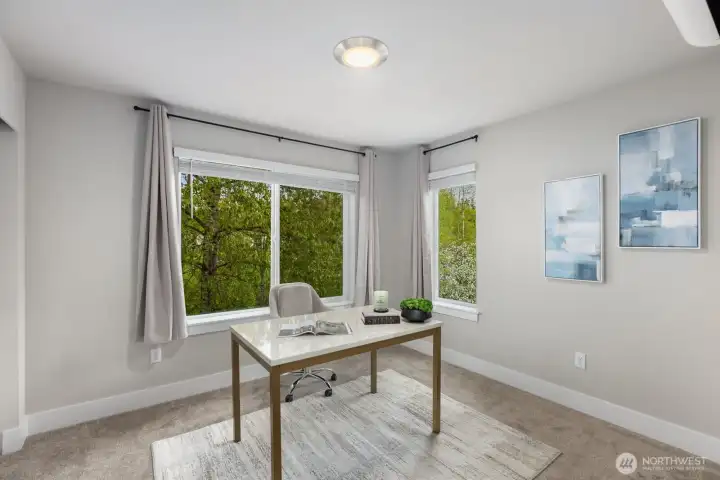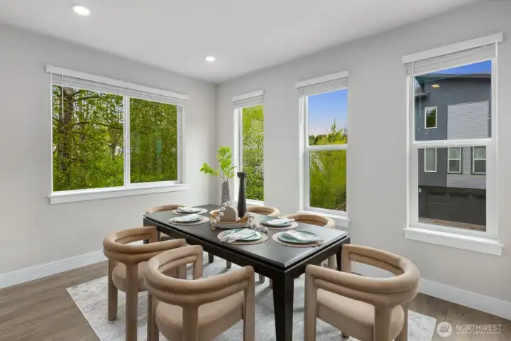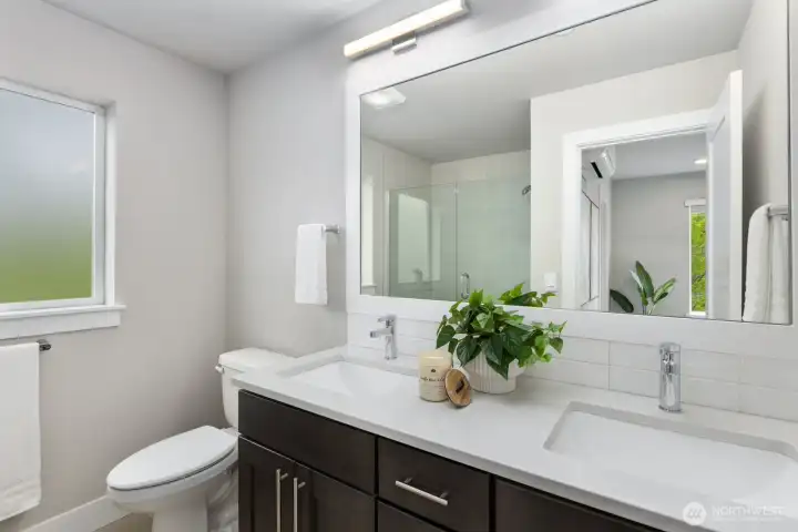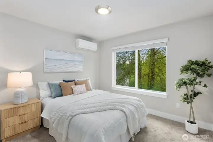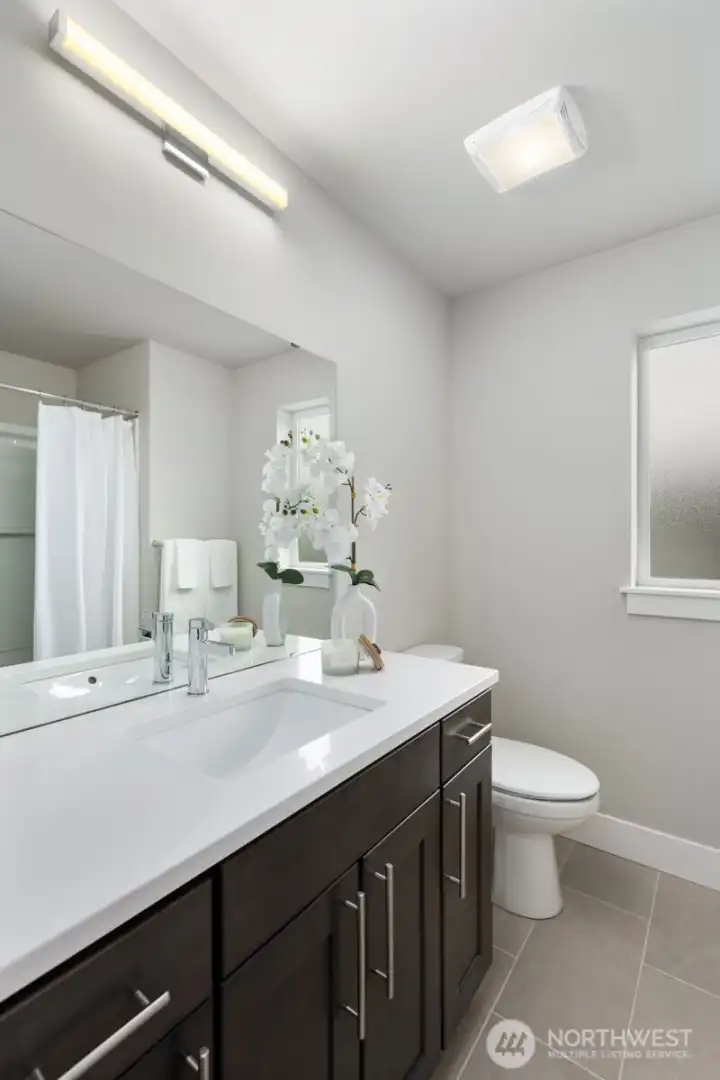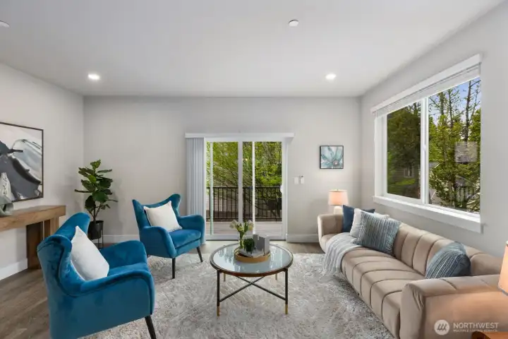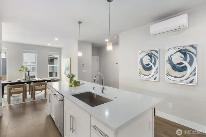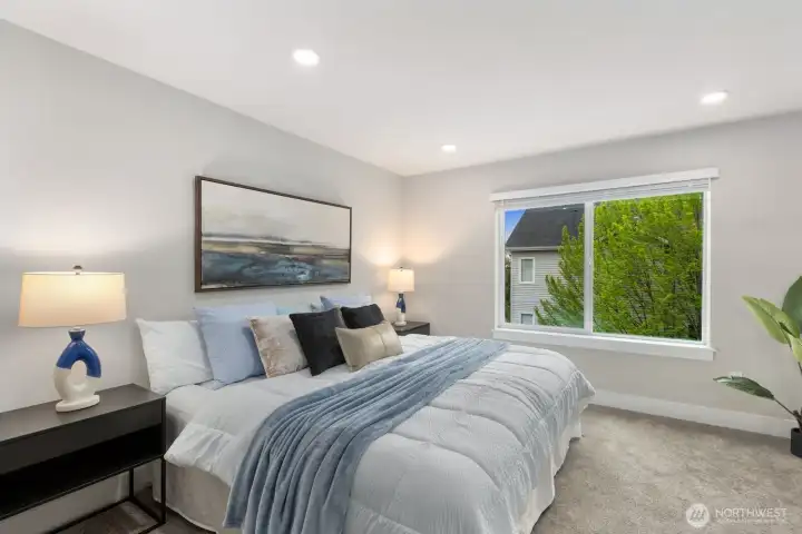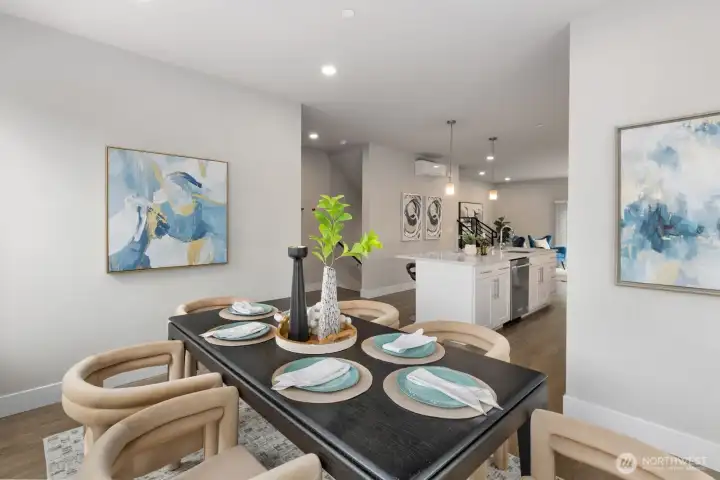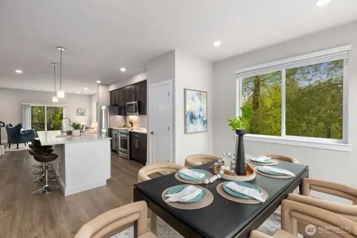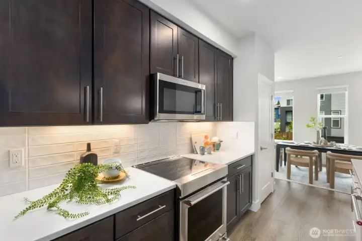 Welcome to this like-new 4-bed, 3-bath townhome! This end unit offers exceptional privacy and abundant natural light throughout. Thoughtfully-designed open layout features elegant finishes and bright living spaces. The generous great room on the main floor leads out to your private deck. Modern chef's kitchen boasts stainless steel appliances, two-tone cabinets, large island, under-cabinet lighting, pendant fixtures and quartz countertops. Entry-level bedroom and ¾ bath with a shower offers flexibility for guests, multi-generational living, or the perfect home office! Upstairs, the primary suite includes a luxurious ensuite with dual vanity, tile shower, and walk-in closet, along with two additional bedrooms and a full bath. Interior highlights include laminate hardwood flooring, ceramic tile, and wall-to-wall carpeting. Enjoy a two-car garage, energy-efficient mini-split heating & cooling, smart home features, EV charging capability, and a prime location near I-405, I-5, top-rated Northshore schools, shops, dining, and community trails.