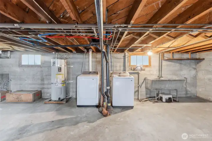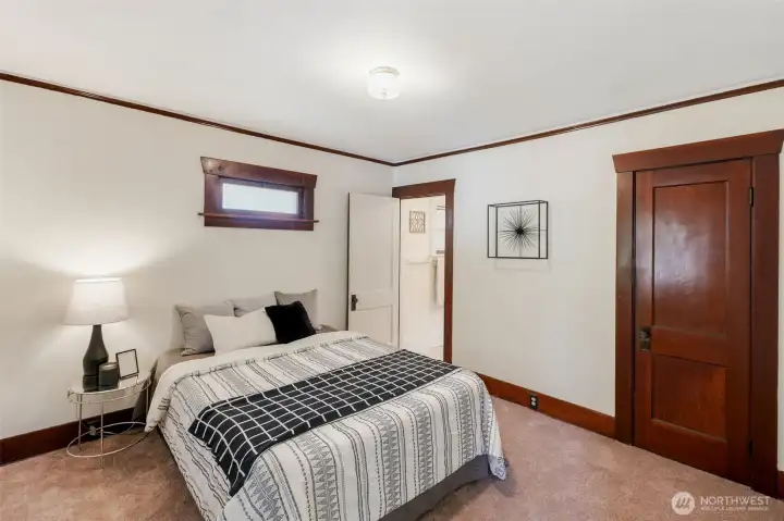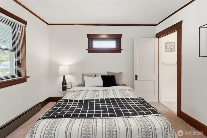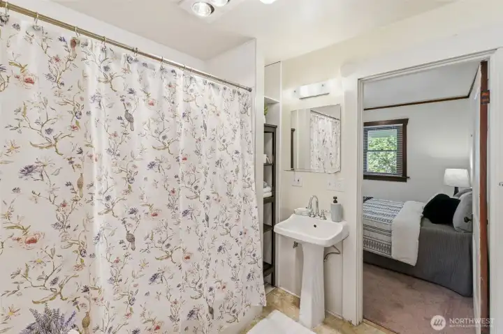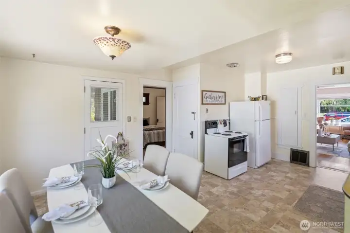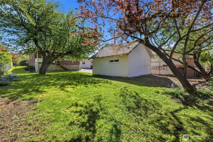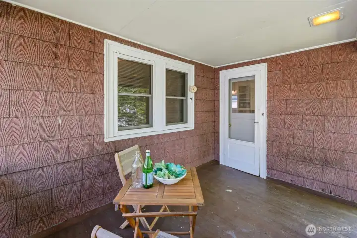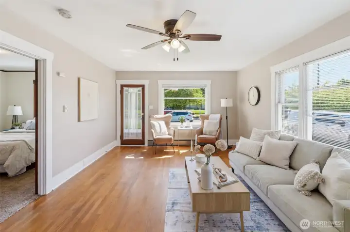 Charming, meticulously maintained, and full of character in the heart of South Tacoma. Tucked into a quiet neighborhood just minutes from everything, this home welcomes you with a classic wood and glass front door leading into a light-filled living room with warm hardwood floors. The kitchen features ample storage, glass-front upper cabinets, and a seamless connection to the eat-in dining area. The full bath is accessible from both bedrooms, creating a comfortable and functional layout. Step outside to a covered back porch overlooking a level, grassy, partially fenced yard, perfect for summer evenings. Recent updates include interior paint, newer washer and dryer, and an updated sewer line. A large basement with exterior access provides excellent storage. Plenty of parking with a long driveway, oversized detached garage, and additional street options.