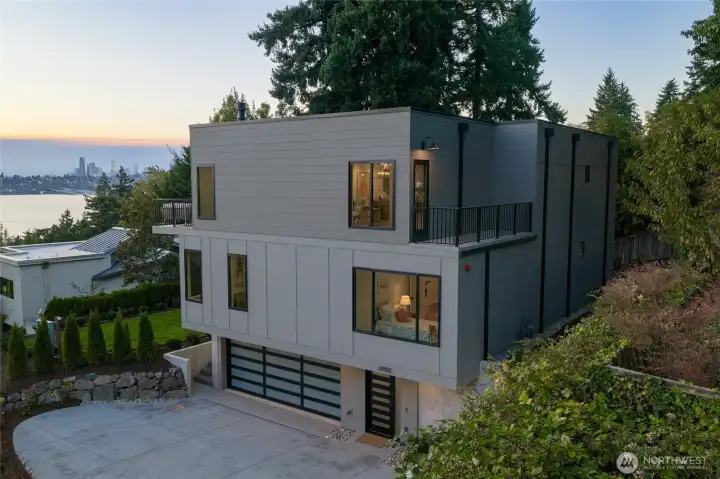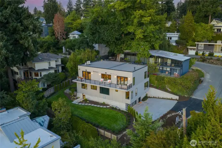 Located down a private lane in the heart of First Hill on Mercer Island, this new construction home by RKK Construction is an exciting concept in urban living in a suburban neighborhood. Western views GALORE and are panoramic. The pair of accordion-style doors open the entire western wall to the heated deck. The enormous great room is built for parties and the glass simply blur the lines between outside and in. Nothing but Lake, City and Mountains views that change on the hour. An island that easily sits 6 is built to entertain. 4 bedrooms plus and office/flex space, all on one floor. Enjoy the flexibility of an ADU, with separate entrance, that can accommodate out of town relatives, an au pair, or provide rental income. Rare LEVEL back yard provides room for play to throw a ball or game of tag. Custom feel and designer color palette make this home far from "cookie cutter." White oak, genuine stained and sanded on site wide plank floors, rift oak custom cabinets, bespoke light fixtures A residential elevator takes everyone to where they need to go and make living and entertaining here effortless. Come see Mercer Island's best value! Amenities include ELEVATOR, GENERATOR, SOLAR PANEL READY, 2 DISHWASHERS, 2 REFRIGERATOR DRAWERS, TWO KITCHEN SINKS, HUGE PANTRY, SLAB QUARTZ, JACK N JILL BATH, LAUNDRY ON BEDROOM LEVEL, AIR CONDITIONING, HEATED DECK.