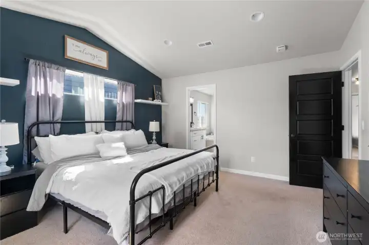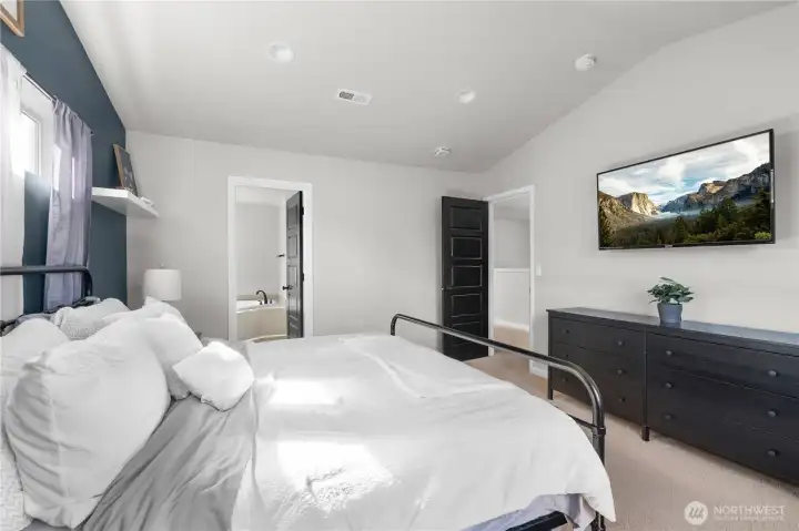 A gorgeous primary retreat featuring dramatic vaulted ceilings and bathed in tons of natural light