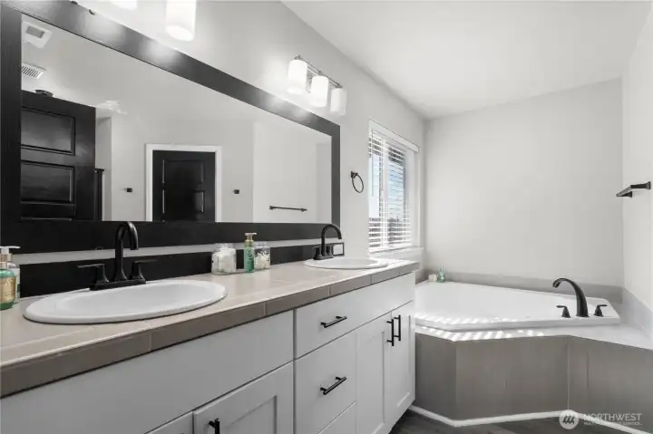 An impressive primary ensuite featuring dual sinks, a soaking tub, and a spacious walk-in closet—the perfect place to relax
