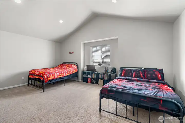 An expansive bonus room featuring soaring vaulted ceilings, offering endless possibilities for a home office, gym, or media retreat