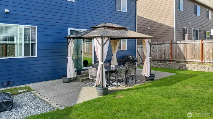 The backyard is beautifully anchored by an expanded patio and a charming gazebo, offering an ideal setting for outdoor entertaining