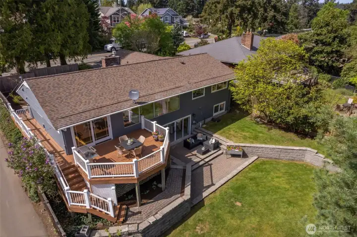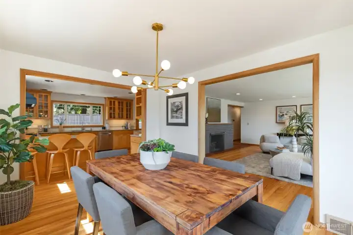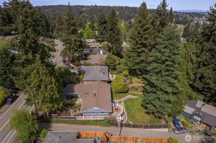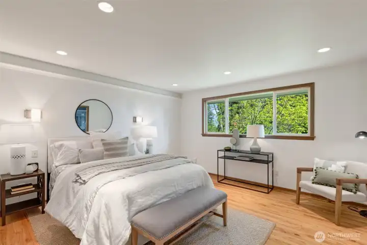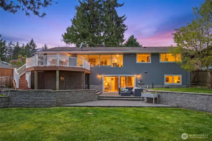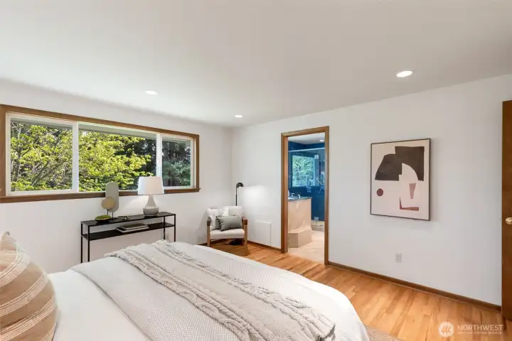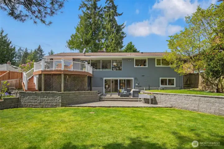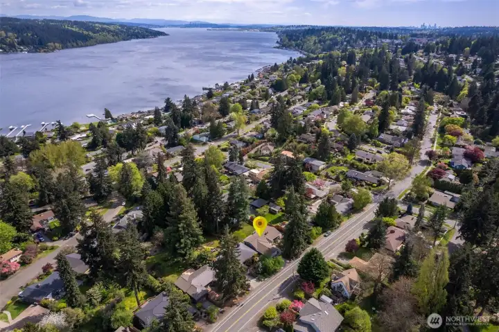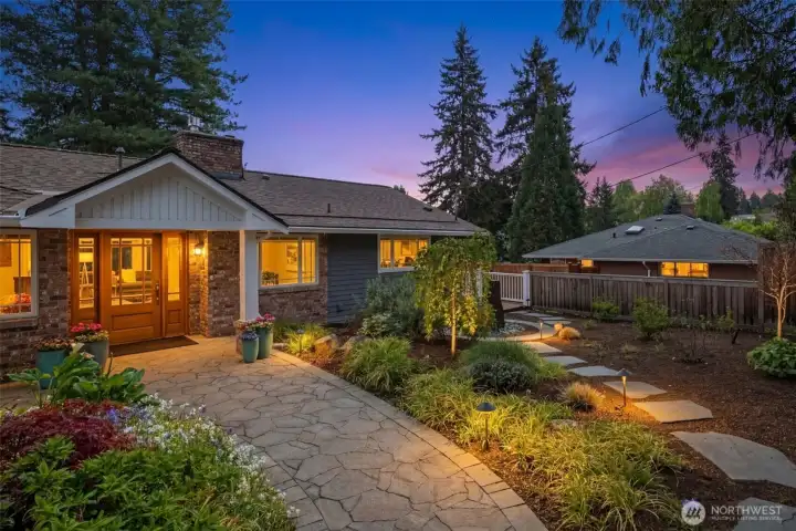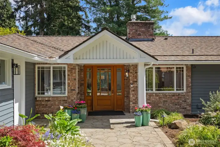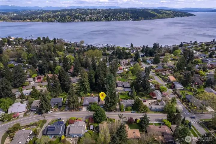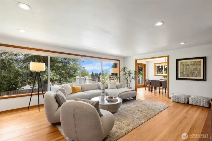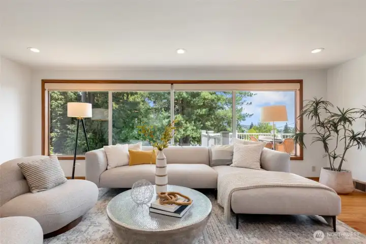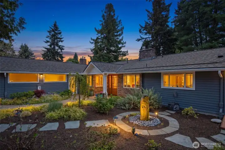 Discover serene Northwest living in this inviting daylight basement 1950’s rambler, perfectly positioned in Lake Forest Park to take advantage of Lake Washington and Mount Rainier views. A beautifully manicured courtyard creates a warm, private welcome. Inside, a dramatic wall of southeast-facing windows fills the expansive living room with natural light while showcasing breathtaking lake and mountain vistas. Rich hardwood floors, generous living areas, and a cozy wood-burning fireplace set the stage for both relaxed living and effortless entertaining.The main level features a chef’s kitchen with commercial-grade appliances, seamlessly connecting to a bright dining area and an entertainment-sized deck overlooking the lush grounds and panoramic scenery. Three spacious bedrooms are located on this level, including a stunning primary suite with view outlooks, a spa-inspired bath with heated floors and a Japanese soaking tub thoughtfully positioned to take in the scenery. One bedroom is thoughtfully suited for a home office.The daylight lower level offers exceptional flexibility, with a large rec room, gas fireplace, wet bar, three additional bedrooms, tiled bath, plus abundant storage and laundry space—ideal for guests or multi-generational living. Outdoors, enjoy a private retreat with patios, expansive lawn space, and tranquil surroundings. Peace-of-mind updates include newer windows, roof, furnace, central AC & hot water heater. Interior and exterior freshly painted.