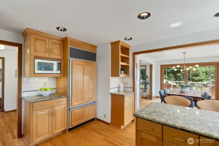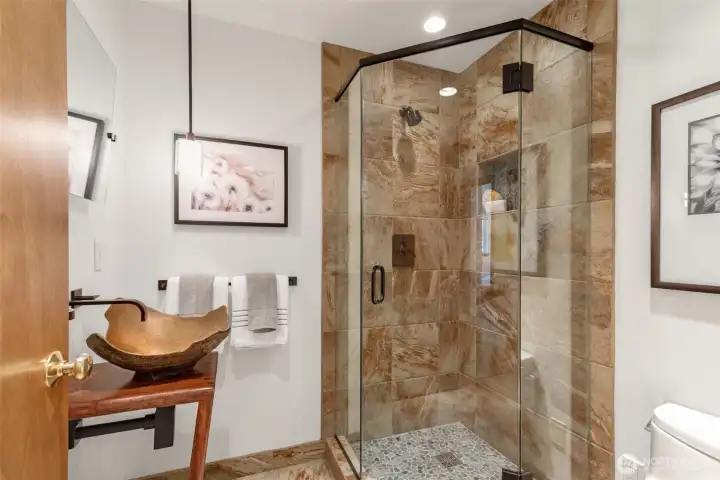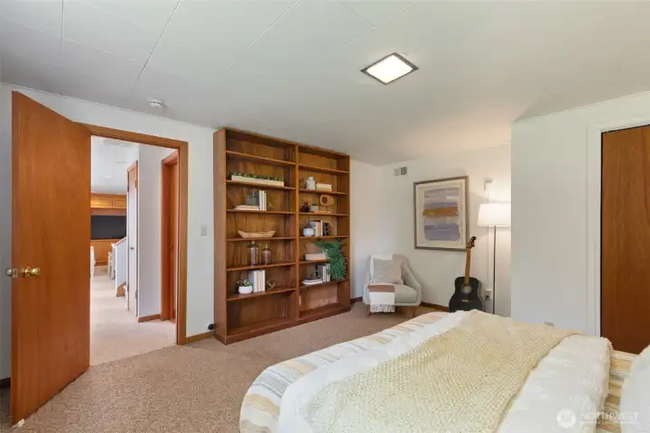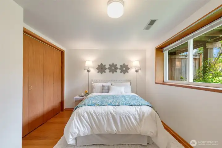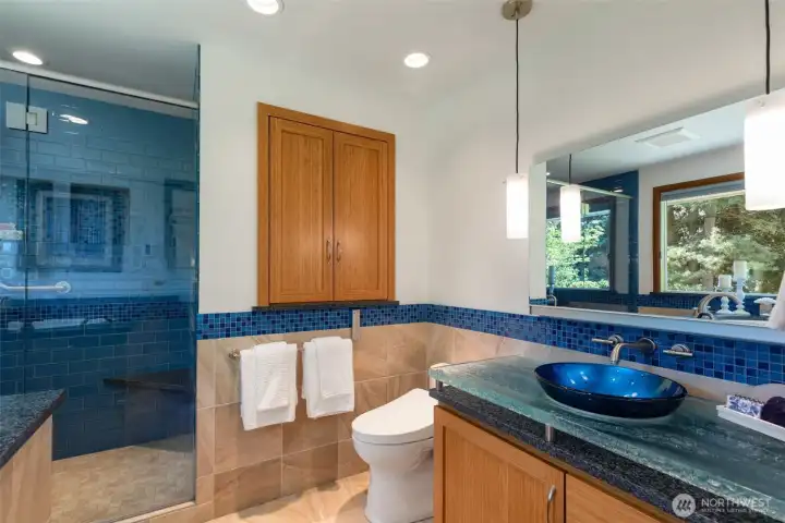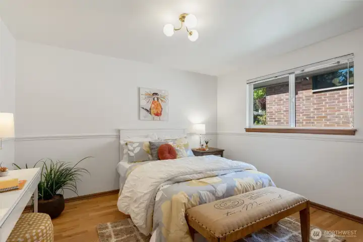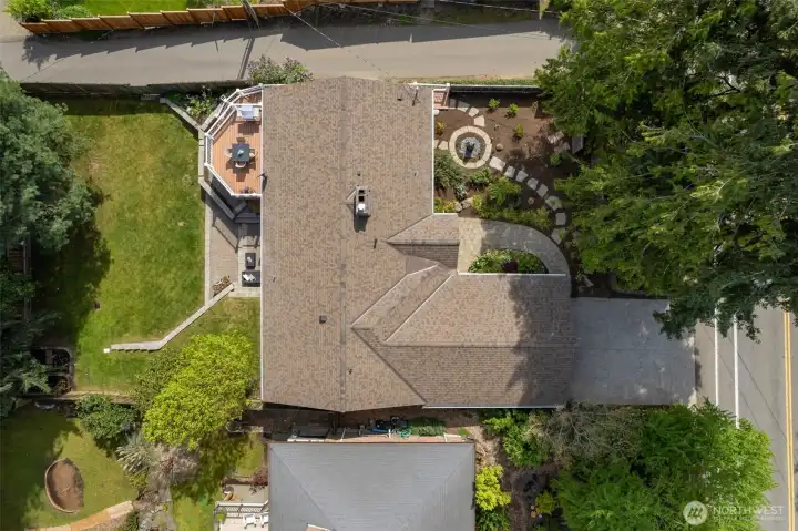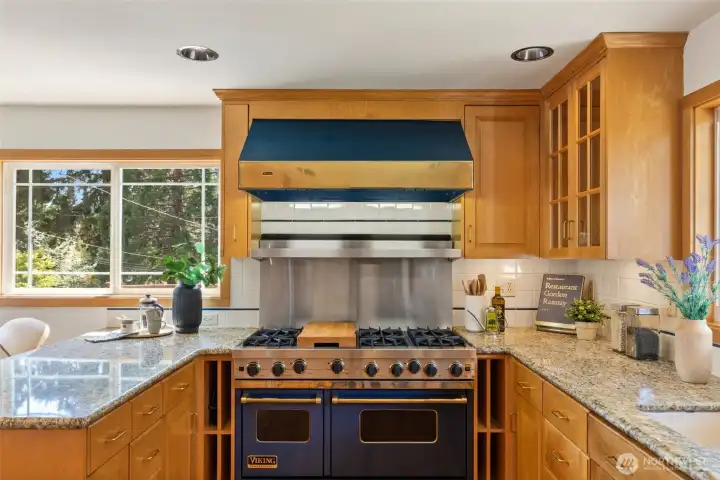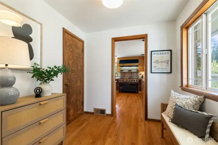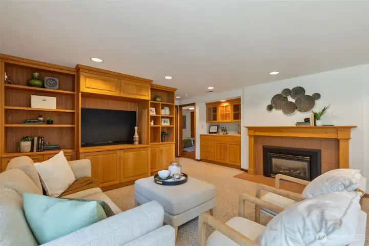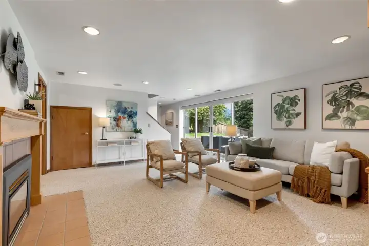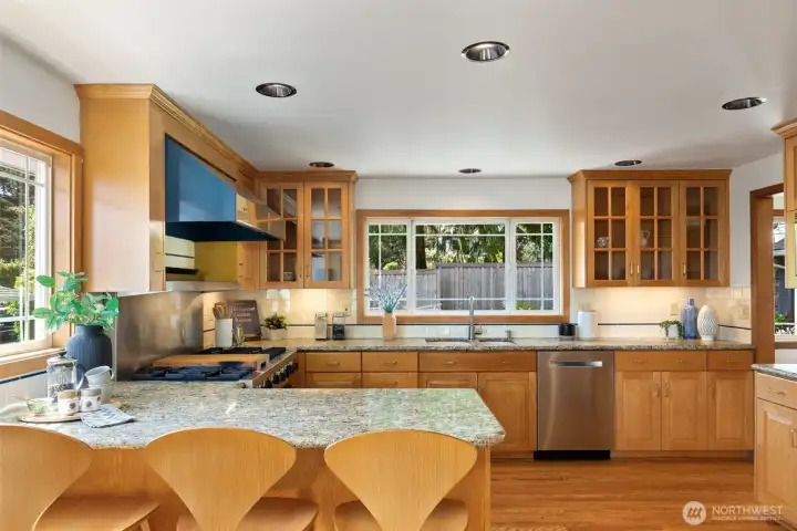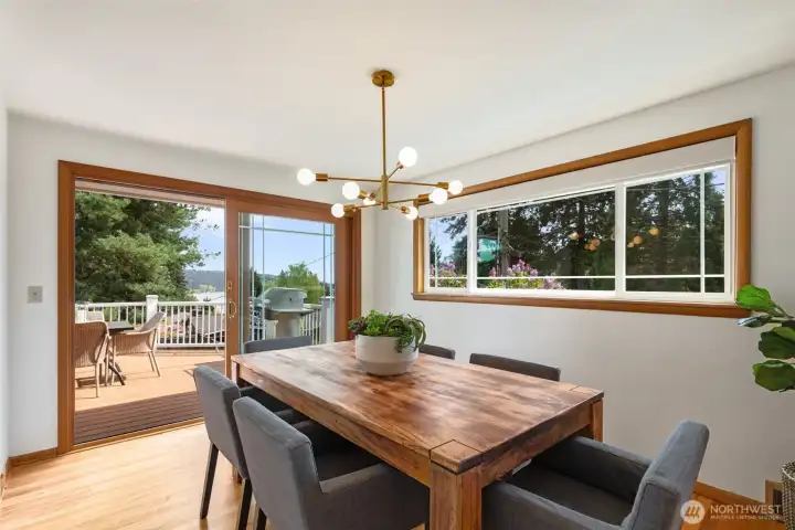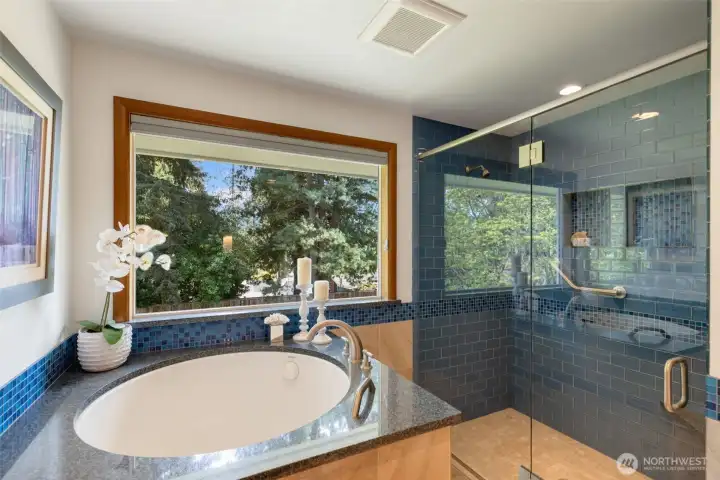 Discover serene Northwest living in this inviting daylight basement 1950’s rambler, perfectly positioned in Lake Forest Park to take advantage of Lake Washington and Mount Rainier views. A beautifully manicured courtyard creates a warm, private welcome. Inside, a dramatic wall of southeast-facing windows fills the expansive living room with natural light while showcasing breathtaking lake and mountain vistas. Rich hardwood floors, generous living areas, and a cozy wood-burning fireplace set the stage for both relaxed living and effortless entertaining.The main level features a chef’s kitchen with commercial-grade appliances, seamlessly connecting to a bright dining area and an entertainment-sized deck overlooking the lush grounds and panoramic scenery. Three spacious bedrooms are located on this level, including a stunning primary suite with view outlooks, a spa-inspired bath with heated floors and a Japanese soaking tub thoughtfully positioned to take in the scenery. One bedroom is thoughtfully suited for a home office.The daylight lower level offers exceptional flexibility, with a large rec room, gas fireplace, wet bar, three additional bedrooms, tiled bath, plus abundant storage and laundry space—ideal for guests or multi-generational living. Outdoors, enjoy a private retreat with patios, expansive lawn space, and tranquil surroundings. Peace-of-mind updates include newer windows, roof, furnace, central AC & hot water heater. Interior and exterior freshly painted.
