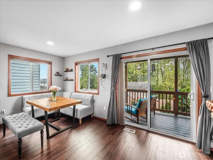 WELCOME to this beautifully maintained 3 bed 2.5 bath home in the sought after sunburst Place community of Lake Stevens offering 1656 sqft of thoughtfully designed living space, this home combines comfort, functionality, and an unbeatable location. Step inside to an open concept main living area featuring rich engineered hardwood floorss and a seamless flow between the kitchen, dining and living areas, perfect for everyday living and entertaining. The kitchen is equipped with modern appliances, ample cabinetry, and easy access to a spacious covered deck, ideal for year round enjoyment and peaceful views of the lake. Primary suite offers a peaceful retreat with lake view, walk in closet and private bath. Two additional bedrooms and a full bath provide flexibility for guests, home office space or hobbies. A convenient power room on the main level and an upstairs laundry area add to the homes practical layout. Set in a quit, well kept neighborhood with NO HOA dues.This home is the perfect balance of low maintenance living and modern comfort!