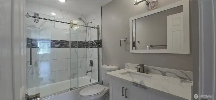 Completely remodeled in 2023, this house features 3 bedrooms and 2.75 bathrooms. The main level includes 2 bedrooms, an updated kitchen with stone countertops, and a laundry room. The downstairs area comprises 1 bedroom, a bonus room with a small kitchenette, a laundry space, and a full bathroom. 2023 upgrades include a new driveway, hardwood floors, new windows, and nearly new appliances. The property is conveniently located near an elementary school, bus routes, and shops. This home is not just beautiful; it also represents a strategic investment opportunity. Zoned R-48, the generously sized backyard and convenient side driveway entrance are ideal for building two Accessory Dwelling Units (ADUs), which offer significant development potential. Buyers should verify zoning details with the city.