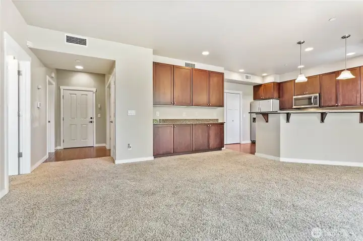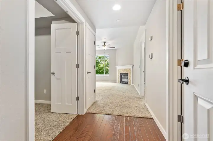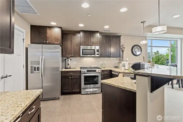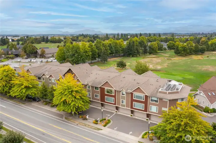 Enjoy secure, low-maintenance living in this bright 2nd-floor unit at the desirable 55+ Chateaux at Garden Green. This 2-bedroom, 2-bath home features an open-concept layout with cozy fireplace, granite countertops, stainless steel appliances, hardwood floors, and bar seating. Spacious primary suite offers its own private bath, while the second bedroom provides excellent guest room/office/flex space. In-unit laundry and a private garage add everyday convenience. Secure building amenities include a 2nd-floor lounge plus a 3rd-floor game room and outdoor patio. Ideally located near fitness center, dining, parks, and trails, with bus nearby and just minutes to downtown Lynden.