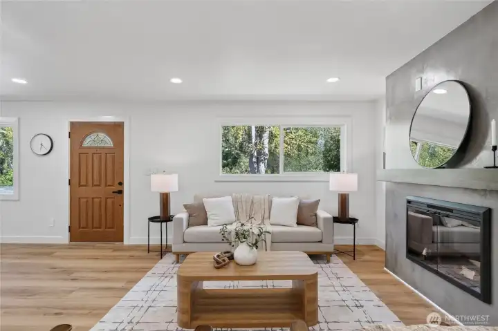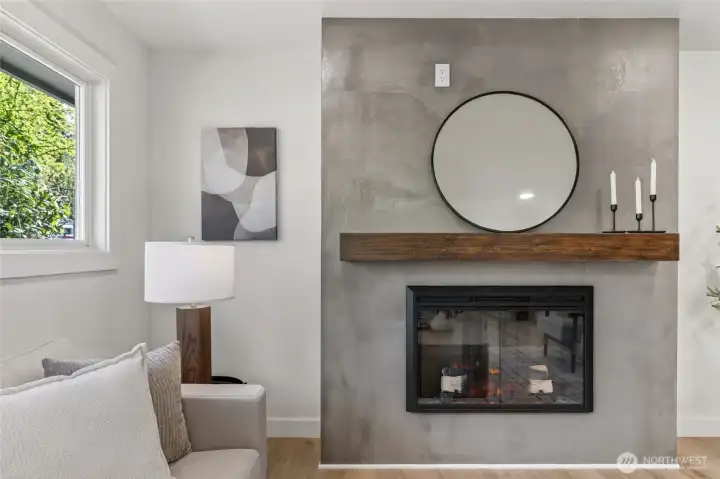Enter the home and find the living area to your left, complete with a cozy electric fireplace perfect for relaxing evenings.