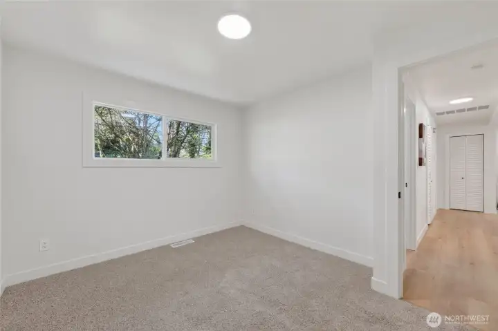The bedroom looks out onto the backyard, bringing in natural light and a sense of privacy.