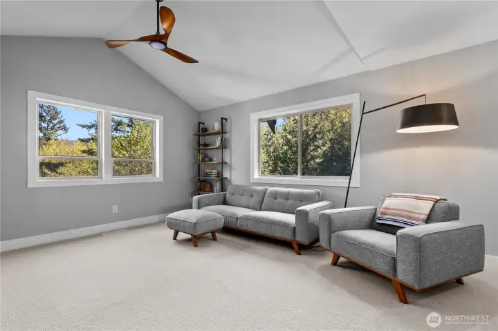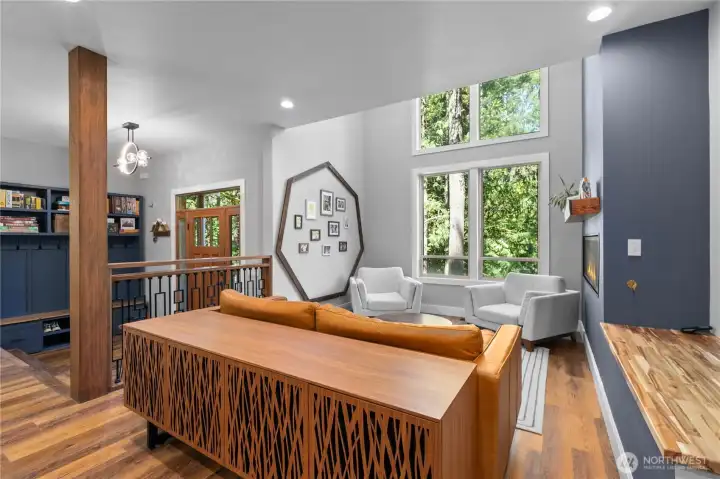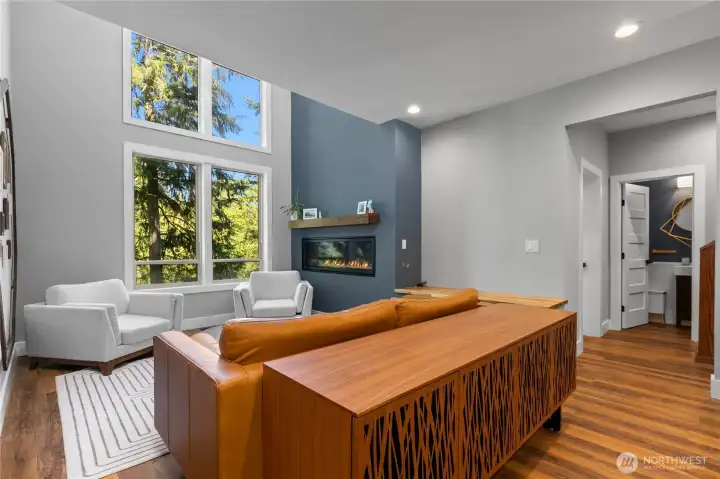 Soaring ceilings and large windows make this space feel bright and inviting while the large 6' gas fireplace offers warmth and comfort.