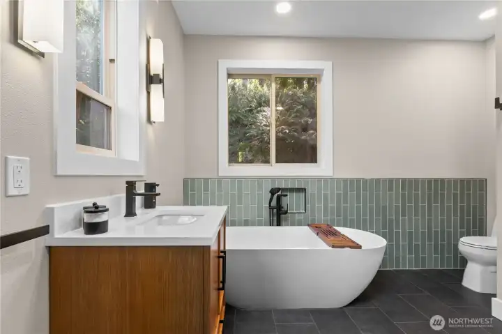 The spa-like en suite features custom tilework, a glass shower and beautiful freestanding tub.