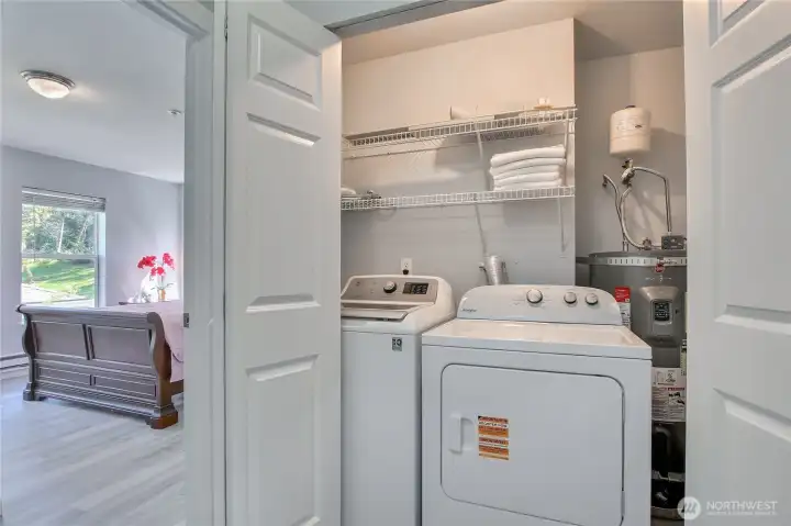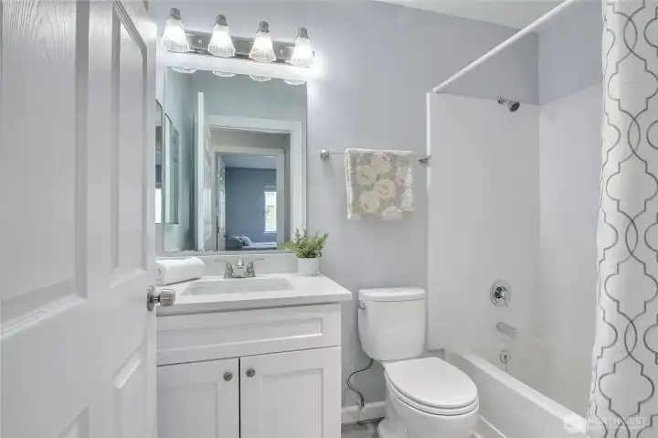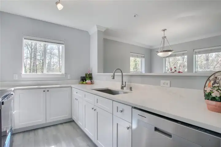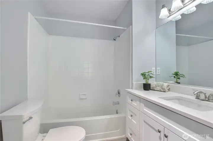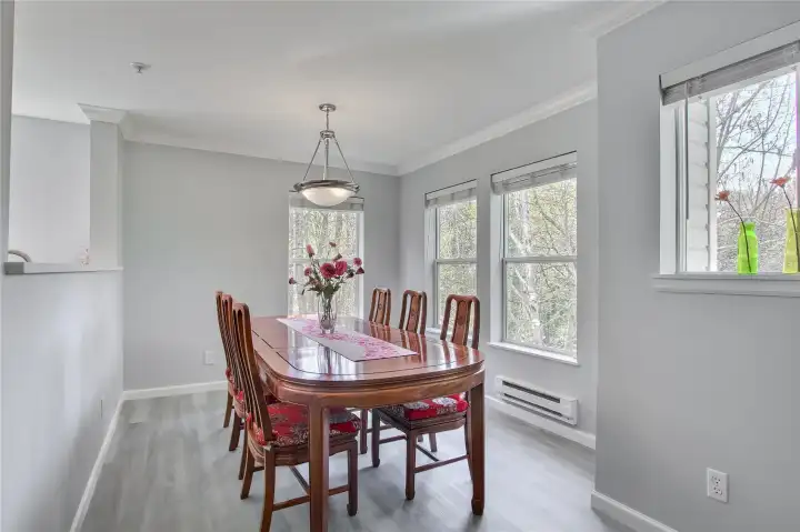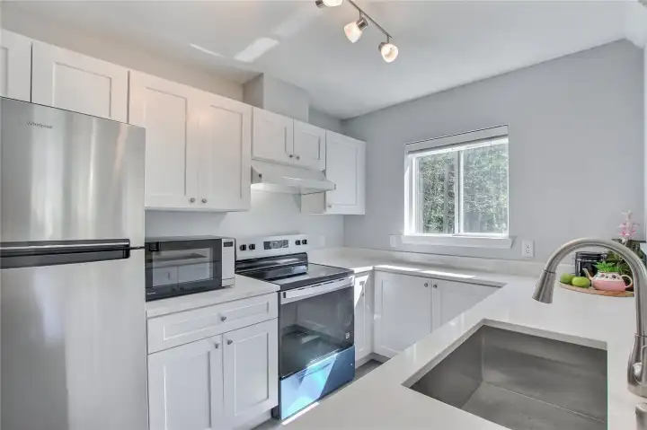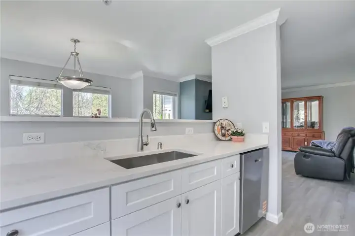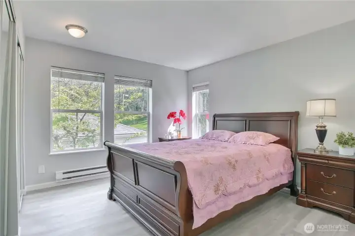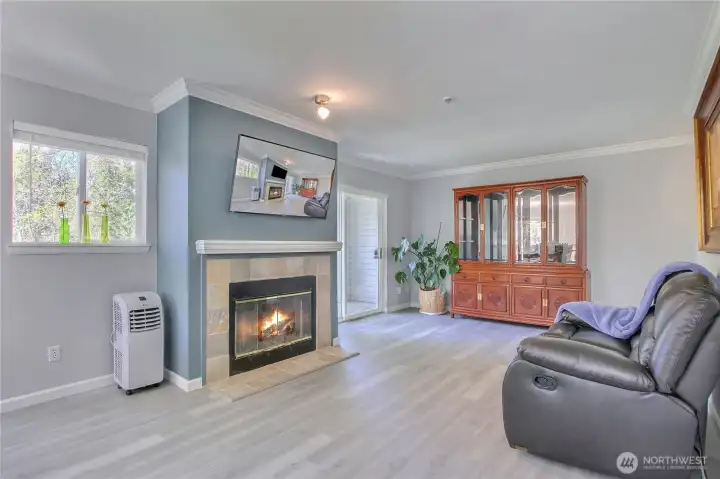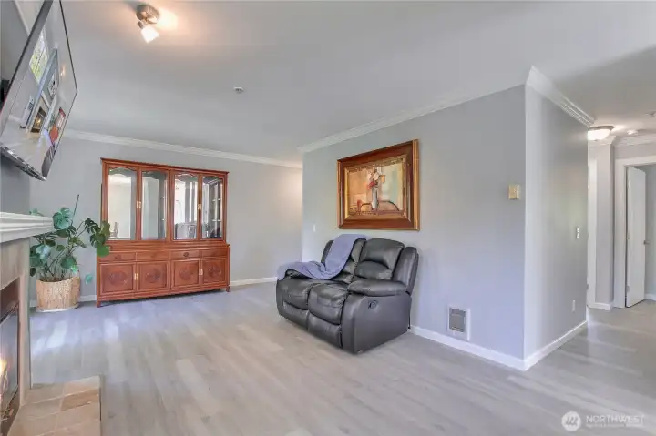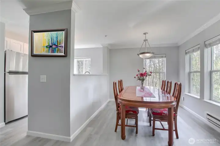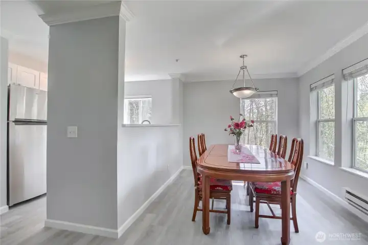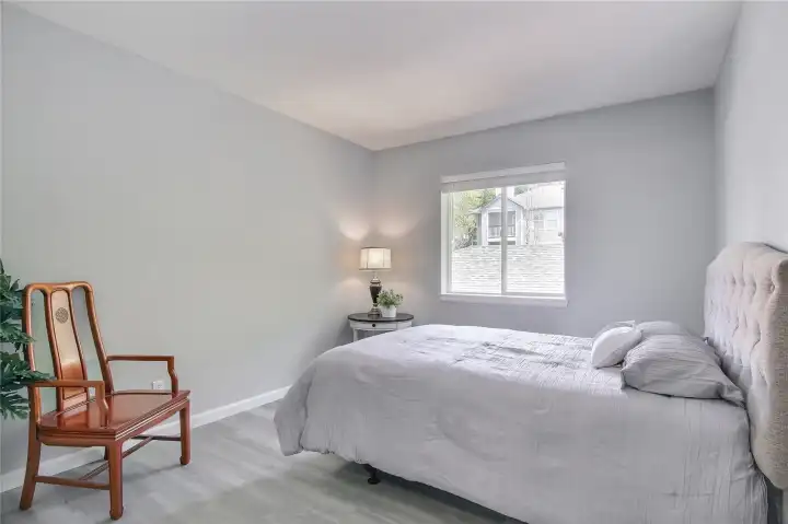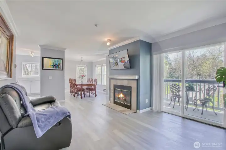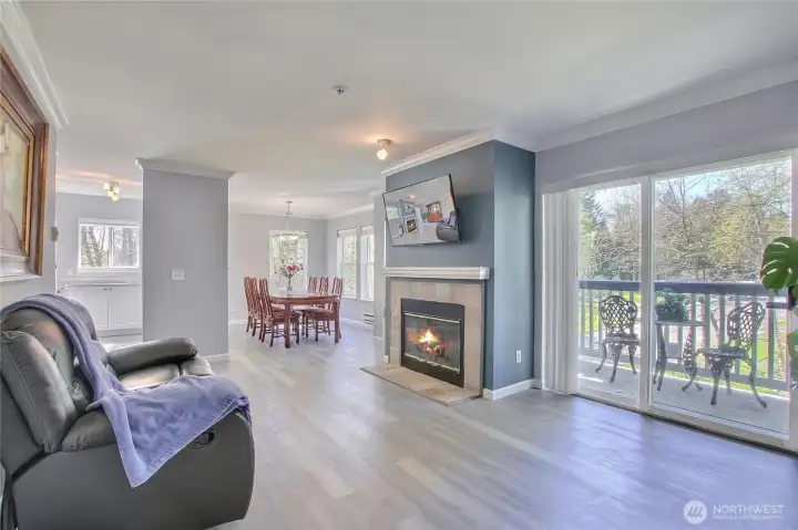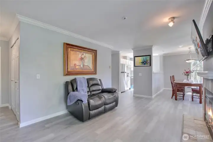 Location! Trendily & beautifully Updated 2 beds 2 full baths Top floor & End unit in Latitude Condominium where centrally located in Federal Way. One staircase w/15 steps to the unit even on the 3rd floor. Bright, Natural lights in & serene park-like setting! Updated Modern color paint, vinyl plank floorings throughout. The Open concept great room has a cozy fireplace. Wall mounted new TV above the fireplace & Free standing AC stays w/new owner's preference. Top Floor Condo looks out at the greenbelt from a private Balcony/deck, A perfect place to relax! Formal dining room has the wall of large windows on both side walls, Tastefully updated kitchen has a window to look out for a greenbelt, single sink w/newer faucet, new garbage disposal, White cabinets, popular quartz countertops, New appliances( Refrigerator, Range/oven, Microwave, DishWasher, Dryer) & Nook. Modernly updated w/Primary bath & Hallway bath. Included utilities in HOA dues are water, sewer & garbage. Stay Cozy on cold days by the fireplace. Completed w/ in-unit laundry as a Newer Washer & New dryer. Short walk distance to the Latitude community amenities: mailbox, Clubhouse w/ fitness center, pool, hot tub, & sauna. Designated 1 car garage(New door) &1 more parking where space is available. Close to the City facilities, Hospital, Dr.'s, Restaurants, Shoppings and walk trails. Easy commute to SR I-5, Hwy 18 to Hwy 167 and Federal Way light link station.Must see this move-in ready property!