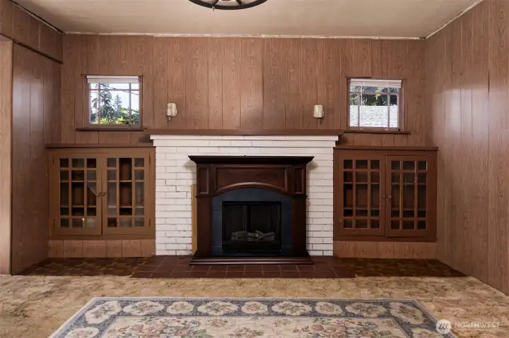 Primary living area with a fireplace and custom built-ins
