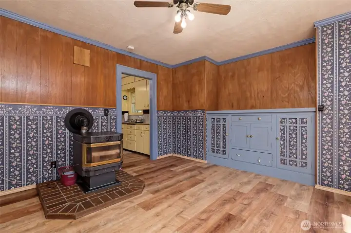 Positioned just off the main living area and kitchen, this versatile space works well as a dining room or extra living area and features a freestanding pellet stove.