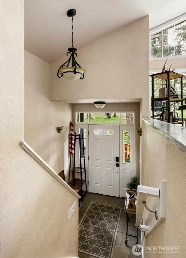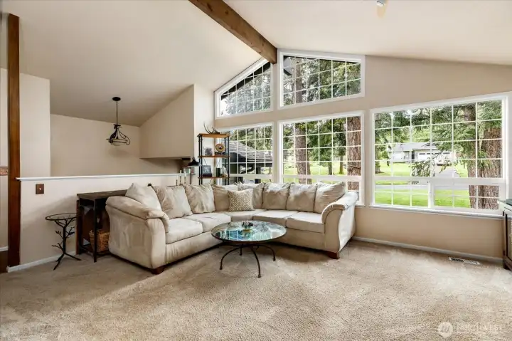 Spacious living room with vaulted ceilings and a cozy fireplace.