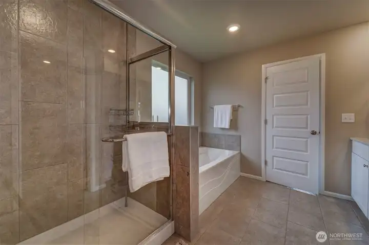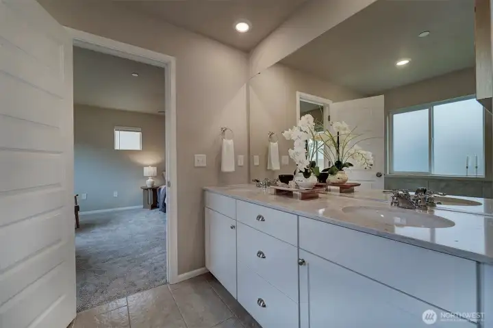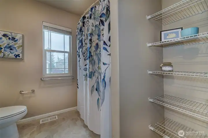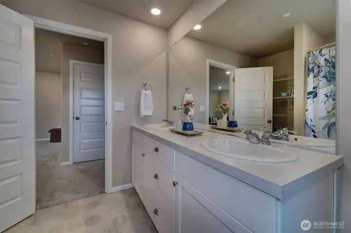 Guest bathroom has double vanity, shower/tub combo, and built-in linen storage.
