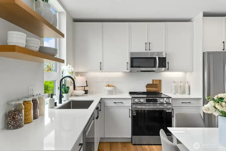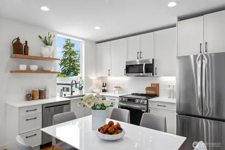 The kitchen features quartz counters, SS appliances, custom cabinets, stylish backsplash and under-cabinet lighting.