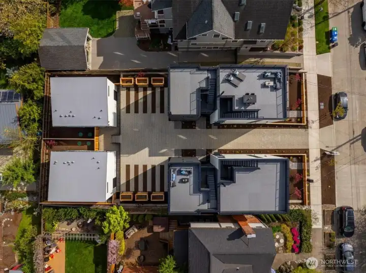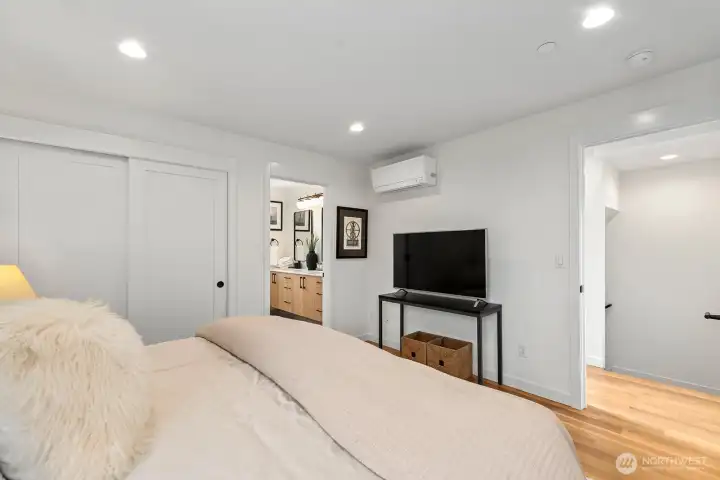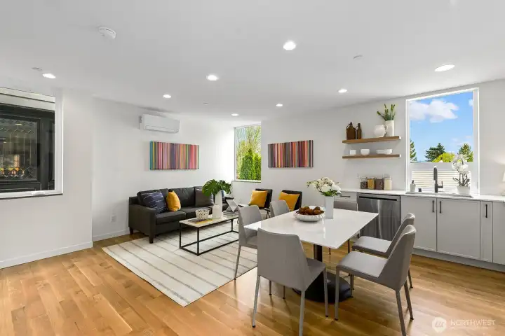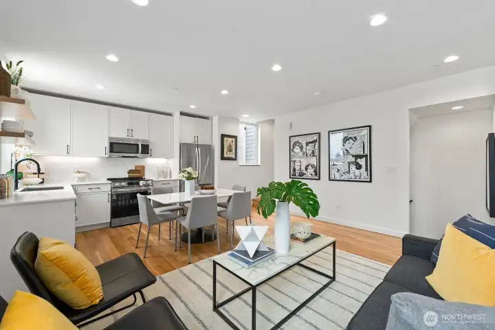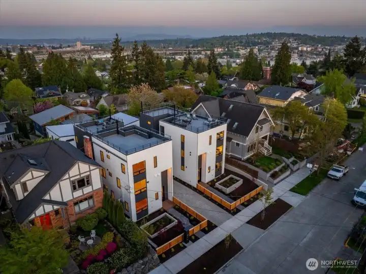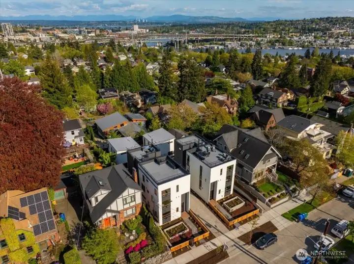 Stunning new construction by Build Sound, ideally positioned in the heart of Wallingford. This thoughtfully executed home offers crisp modern architecture, clean lines, real hardwood floors, elevated finish quality, abundant natural light, and picturesque Seattle views. The entry level features a spacious bedroom with a private en suite full bath—perfect for guests, a home office, or flexible living. On the second floor, enjoy bright open-concept living anchored by a chef’s kitchen with custom cabinetry, quartz countertops, stylish backsplash, and stainless steel appliances. The third level serves as a serene primary retreat, complete with a luxurious en suite bathroom. Crowning the home is an expansive rooftop deck offering sweeping views of the Olympic and Cascade Mountains, the Space Needle, and Lake Union—an ideal setting for entertaining or unwinding. With a Walk Score of 91, you’re steps from Wallingford’s vibrant collection of shops, restaurants, cafes, parks, and more. Additional highlights include dedicated EV ready off-street parking, mini-splits for efficient heating and cooling, additional storage, and convenient access to I-5 and Highway 99. If you’re seeking well-located new construction that’s built to last, this exceptional home delivers.