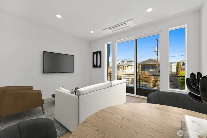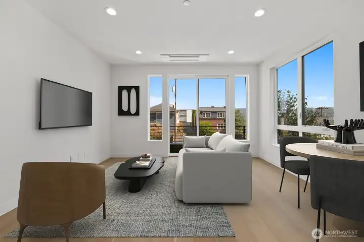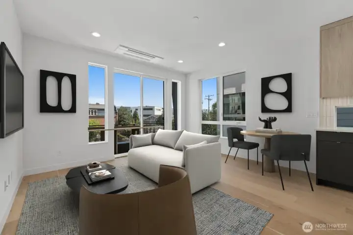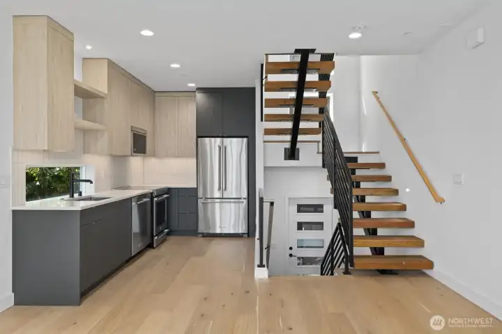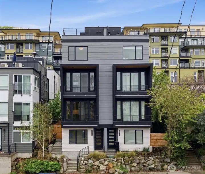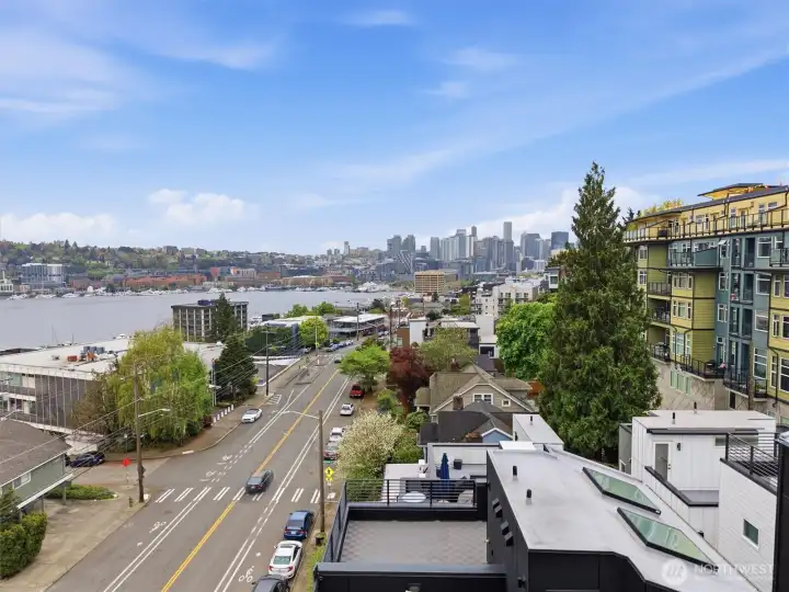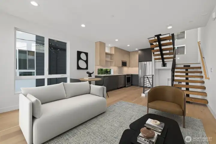 LAST HOME! Right in Westlake, where everything feels close but never crowded, this home puts you minutes from Lake Union, SLU, and the café-lined edges of Queen Anne. Your private rooftop deck sets the tone—lake views, city lights, and summer nights that stretch a little longer. Inside, the layout is open, bright, and built to connect. Three bedrooms offer flexibility, while the main level flows seamlessly for both everyday living and hosting. The kitchen is clean and modern with a social feel, anchored by a sleek island and quality finishes. A floating open-tread staircase adds a sharp architectural moment, and a bonus flex space easily adapts to WFH or a home gym. Zoned heating and A/C keep things comfortable year-round, with covered EV-ready parking, WA/DR included, engineered hardwoods, and smart storage throughout. A refined take on urban living, right where Westlake hits its stride.