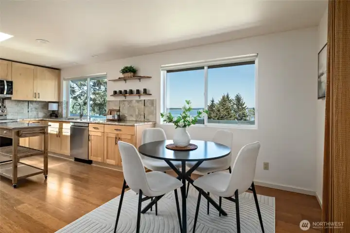 Large kitchen with huge picture windows and access to the side deck