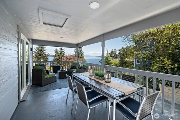 Covered deck with space for oversized out door furniture and beautiful water views