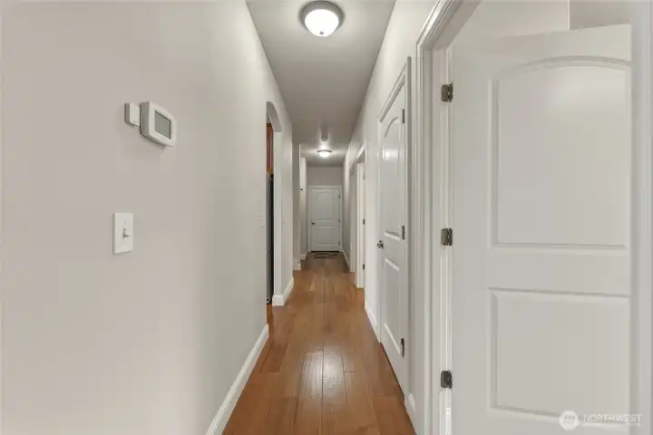 Hallway to private Primary suite & North side deck