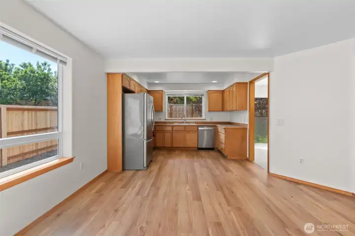 Vaulted kitchen with new appliances and just installed luxury vinyl flooring through family room