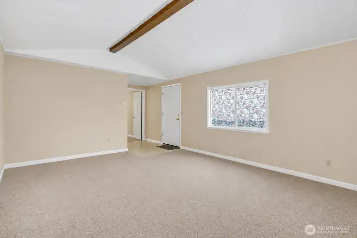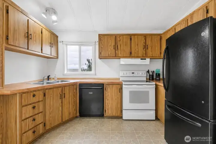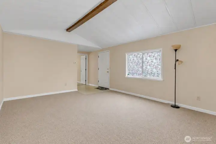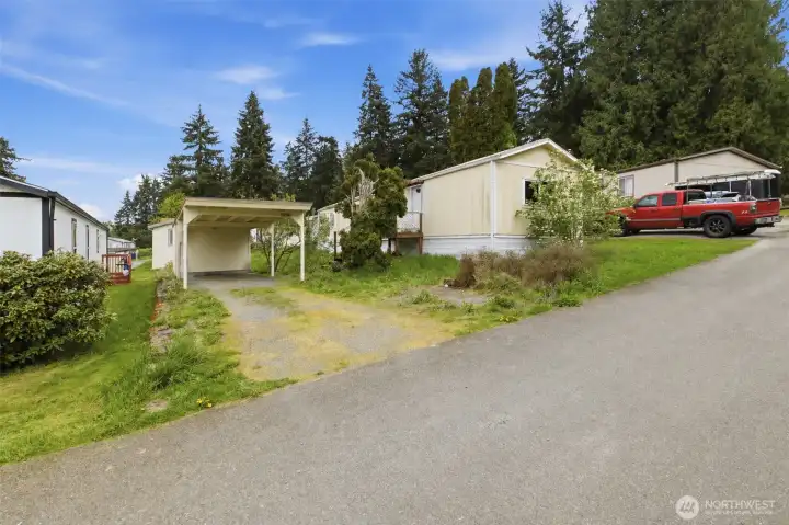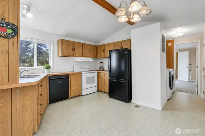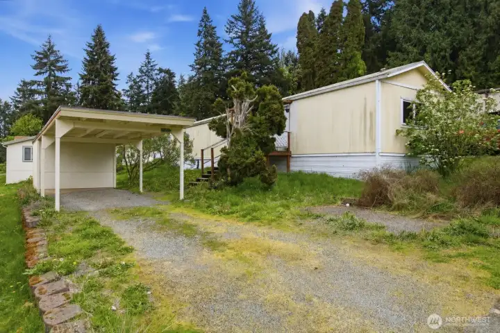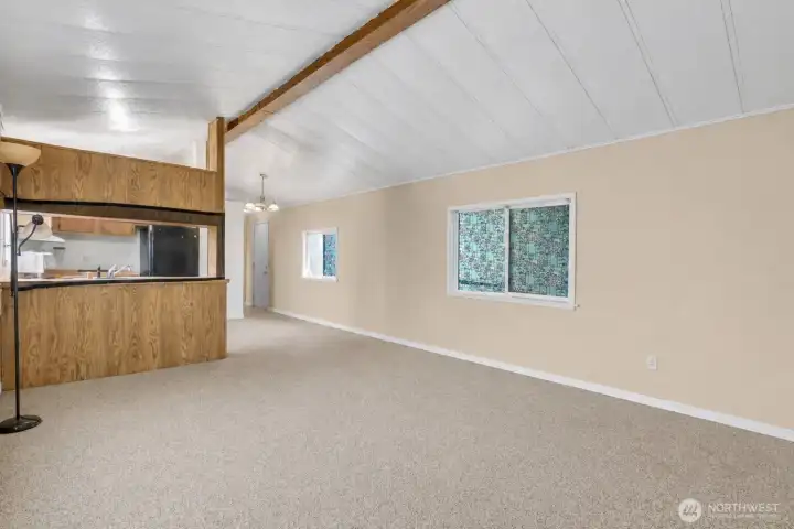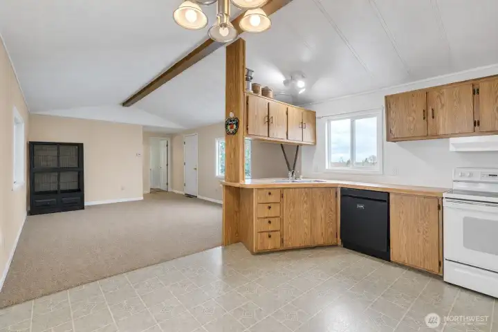 Hurry on this AFFORDABLE opportunity to own an open and spacious vaulted 2-bedroom, 2-bath manufactured home! Vaulted ceilings throughout create a light, airy feel that lives larger than the square footage. Thoughtful split-bedroom design with bedrooms on opposite ends offers ideal privacy. Covered carport for convenient parking and a generously sized yard with room to enjoy the outdoors. The park has a peaceful country feel while still being close to everyday amenities. Kitchen includes range, refrigerator, and dishwasher. RARE find at this price and condition—bring your vision, a little paint and TLC, and make this home shine!