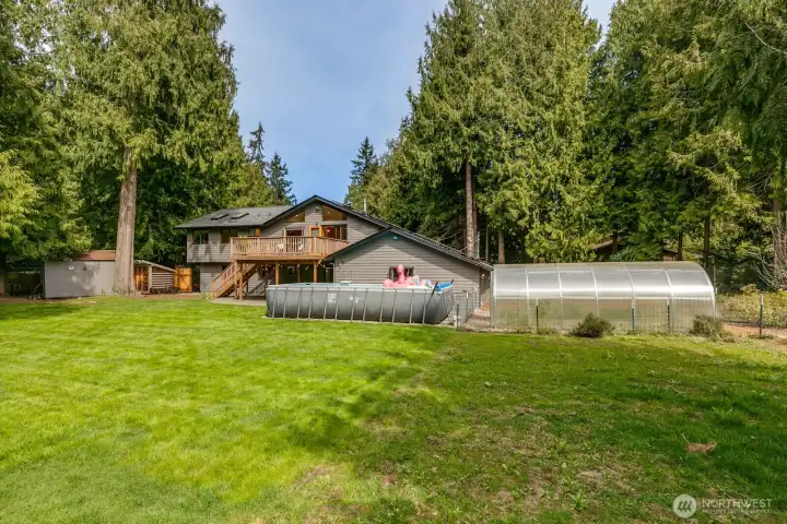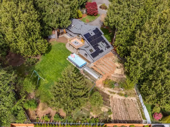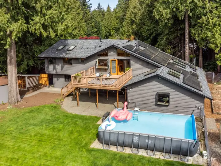 This 4 bedroom home has it all!!! HUGE level yard, giant rec room, movie den, heated pool, sauna, gym room, solar panels w/net metering, green house, giant garden, fruit trees, Toy/RV parking, playhouse, sunny kitchen w/Viking range, huge windows and vaulted ceilings, cul-de-sac living, all within the desirable neighborhood of Wingate. Fantastic location close to beach, shopping & commutes. 2024 roof, new exterior & interior paint & carpets this month. To reiterate... this home is backyard bliss on over half an acre, enjoy a workout in the gym & sweat in your sauna, followed by a cool down floating in your pool heated using free solar power from the sun. Go pick some veggies in your greenhouse & garden to make dinner in your sunny kitchen. After enjoying a meal on your large backyard deck, stroll through your upstairs living room with vaulted ceilings, huge windows and cozy gas fireplace to head downstairs to the giant rec room for some games, followed by a movie in the movie den, a perfect evening. Neighborhood boasts walking trails, quiet streets, mature trees and fantastic Mukilteo schools within walking distance.
