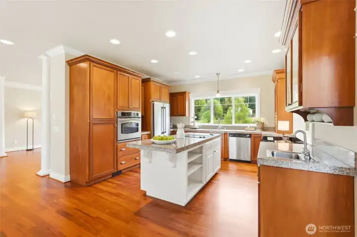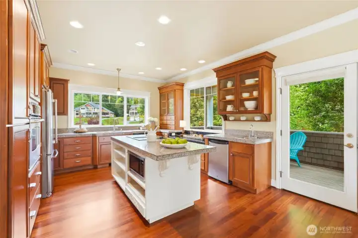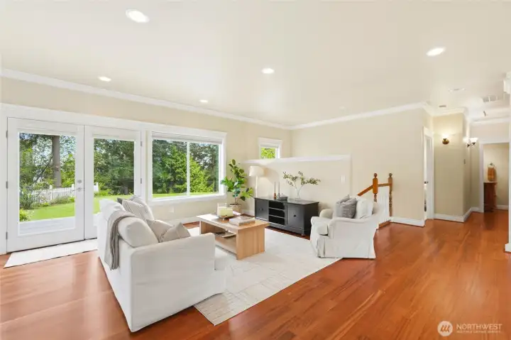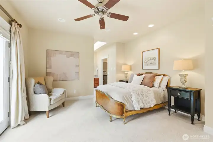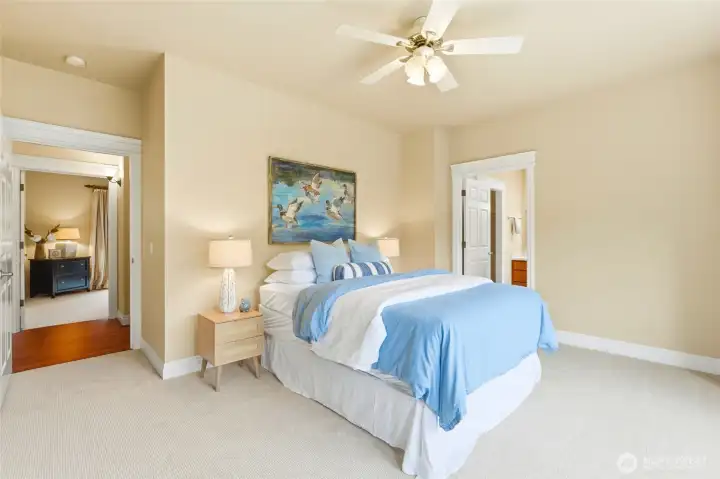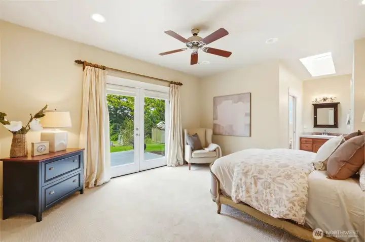 Charming Cape Cod **With Deeded Beach Access** on half an acre with peek-a-boo Sound views and a layout that truly lives. Newly refinished hardwood floors, fresh new carpet throughout, and a large new composite deck set the tone for move-in ready island living especially with summer around the corner! The great room flows to a separate dining and living area anchored by a gas fireplace. Two primary suites each offer walk-in closets — ideal for multigenerational living or hosting guests in style. The cherry cabinet kitchen features an island and generous storage the leads to a side covered porch. Lower level delivers a huge bonus room, third bedroom, full bath, and plumbing ready for a second kitchen or wet bar. Outside: a 2-car garage with EV charging station, a fully drywalled and heated wood shop with workbench and utility sink. Forced air heat and A/C heat pump for year-round comfort. No stress over worrying about ferry times — just drive on and come home to Camano Island!