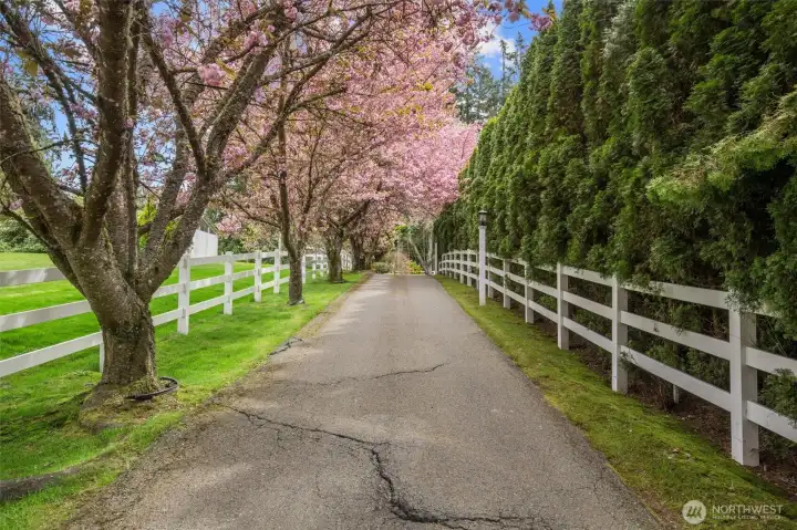Arrive home down a cherry tree lined private drive to this Hollywood Hill wine country estate. Traditional meets modern in this custom 4,034 square foot home tucked away on a serene 1.1 acres backing to a quiet greenbelt. Formal living and dining rooms open up to second central dining space with fireplace overlooking bonus room with sunny surrounding windows and dramatic two story fireplace. Anchored by a central kitchen with real wood shaker cabinets and granite countertops. Adjoining large office suitable for multiple workspaces and unique sunroom for indoor/outdoor year round living. Primary suite overlooking lush landscaping with a full 5 piece bathroom complete with soaking tub and generous walk in closet. Upstairs family media room and additional office / flex space lead to the second rear staircase, leading back downstairs to the largest laundry/mud room you’ve ever seen! 3 car garage fit for a collector with epoxy coating, EV charger and optional storage system. 1.1 beautiful private acres with a hot tub, patio, firepit, multiple decks and iconic grape covered arbor. Newly refinished hardwood floors, carpet, real wood garage doors with new Lift Master side openers, extended driveway for additional or RV parking, newer tankless water heater, Heat pump with A/C, and roof!