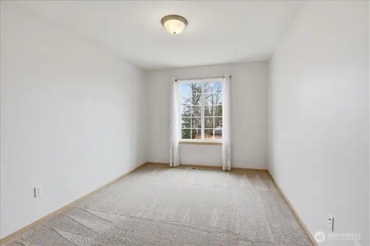 Bright family room off dining and kitchen with newer carpet and gas fireplace.