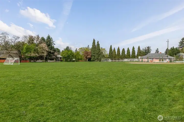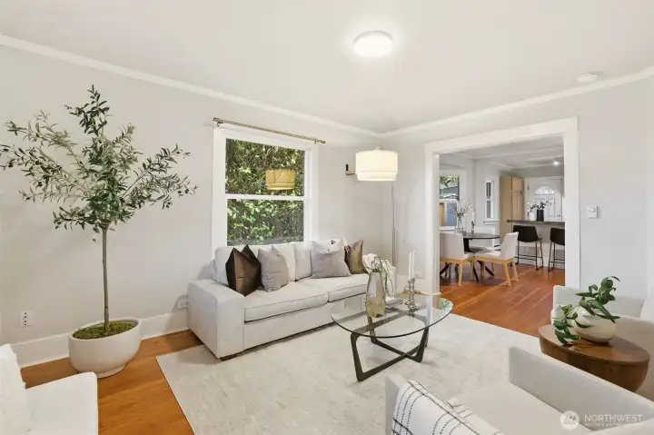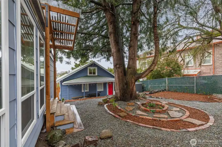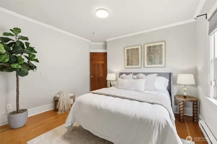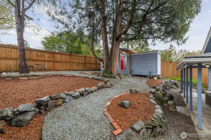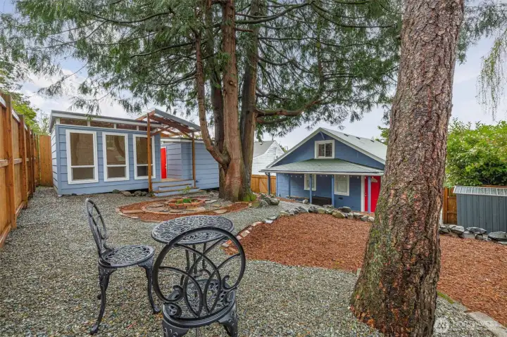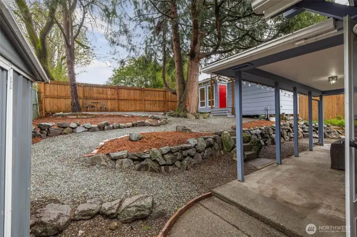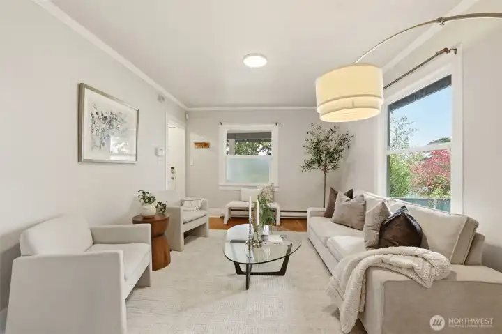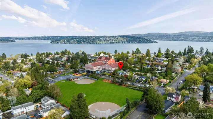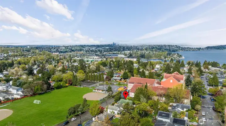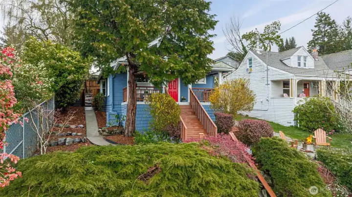 Park adjacent NW Craftsman on a private, dead-end street with rare parking and only one neighboring home. This charming 2-bed, 1 bath bungalow offers open green views, covered patios, and a fully fenced backyard oasis. Sip coffee on your covered patio overlooking Hutchinson Park with glimpses of DT Seattle & Lake WA. Two detached studios (+240 sqft, 2019) w/ additional 3/4 bath and utility sink offer incredible flexibility, ideal for guests, creative space, or income potential. Inside features original hardwoods, modern kitchen with custom counters, and a spa-like bath with radiant heated floors. Additional upgrades include LVP kitchen flooring, newer GE kitchen appliances (2021), Samsung washer and dryer, fresh interior paint, professional roof cleaning (2026), and gutter guards. Located just minutes to I 5, light rail, Lake Washington, and The Landing. Pre inspection and sewer scope available.