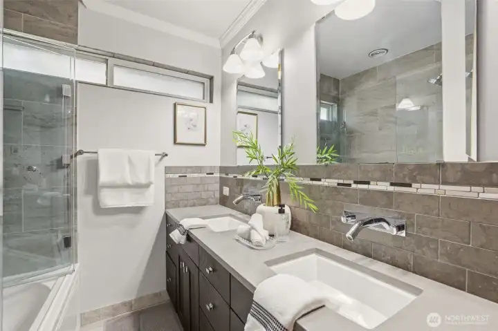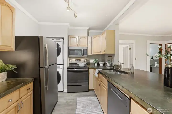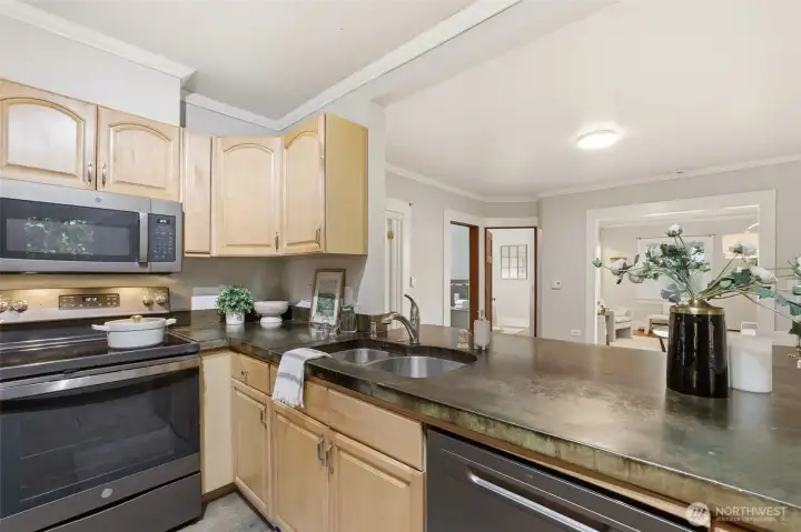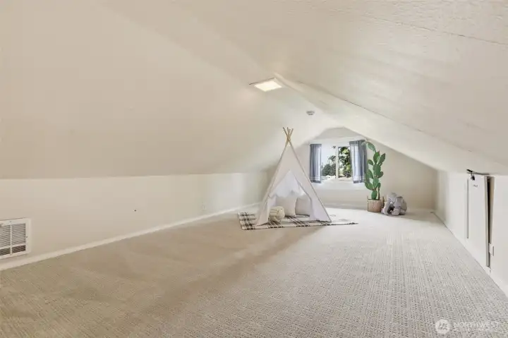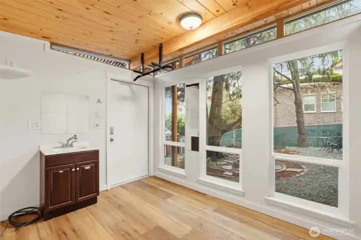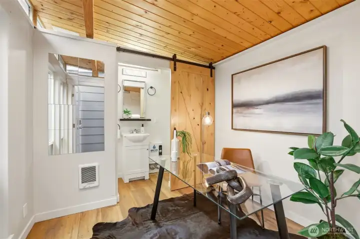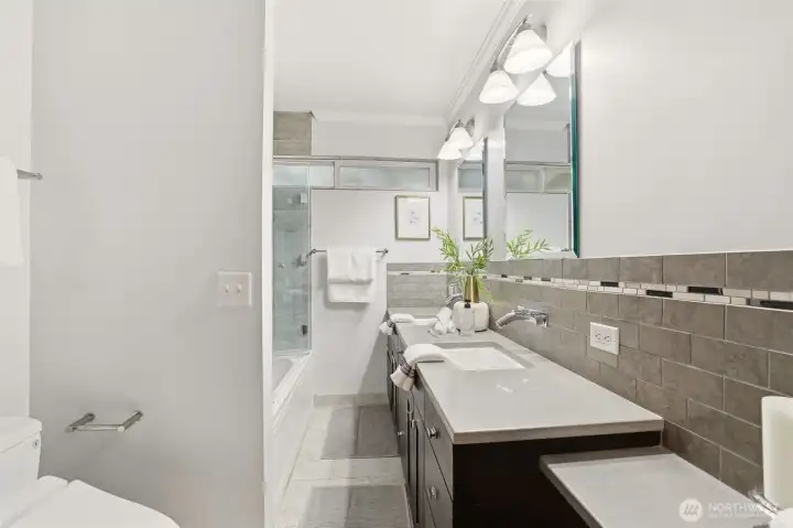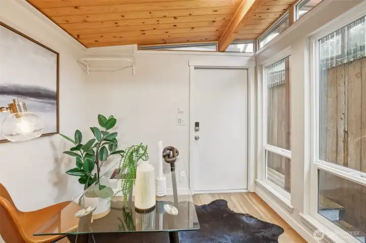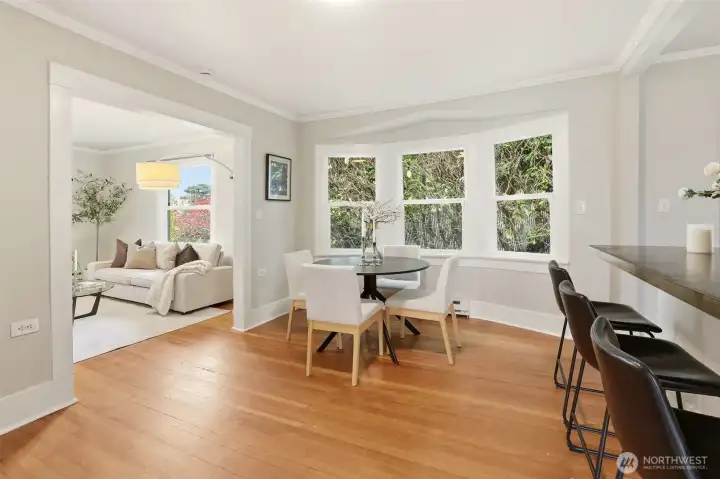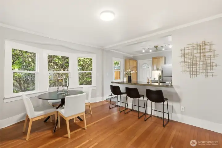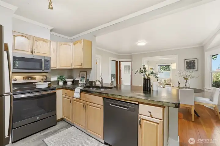 Park adjacent NW Craftsman on a private, dead-end street with rare parking and only one neighboring home. This charming 2-bed, 1 bath bungalow offers open green views, covered patios, and a fully fenced backyard oasis. Sip coffee on your covered patio overlooking Hutchinson Park with glimpses of DT Seattle & Lake WA. Two detached studios (+240 sqft, 2019) w/ additional 3/4 bath and utility sink offer incredible flexibility, ideal for guests, creative space, or income potential. Inside features original hardwoods, modern kitchen with custom counters, and a spa-like bath with radiant heated floors. Additional upgrades include LVP kitchen flooring, newer GE kitchen appliances (2021), Samsung washer and dryer, fresh interior paint, professional roof cleaning (2026), and gutter guards. Located just minutes to I 5, light rail, Lake Washington, and The Landing. Pre inspection and sewer scope available.