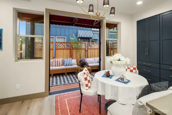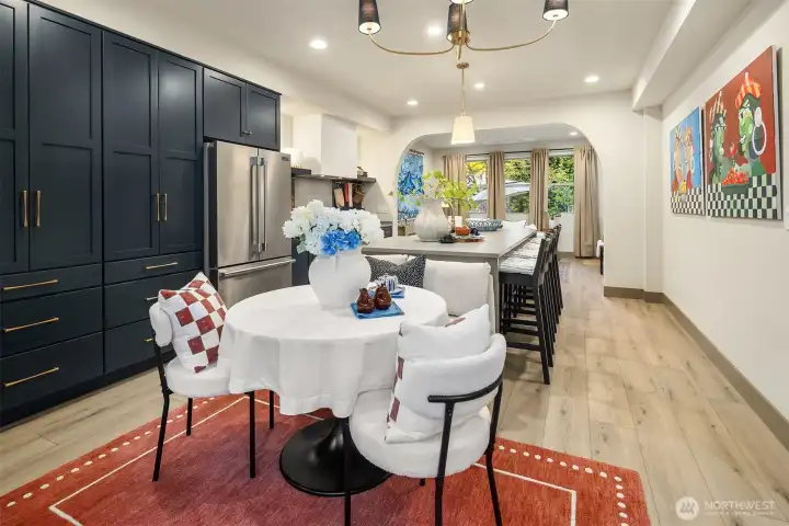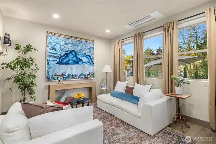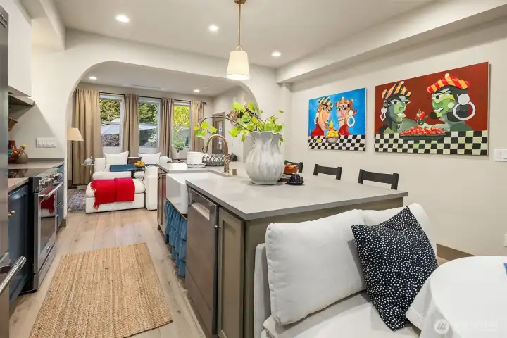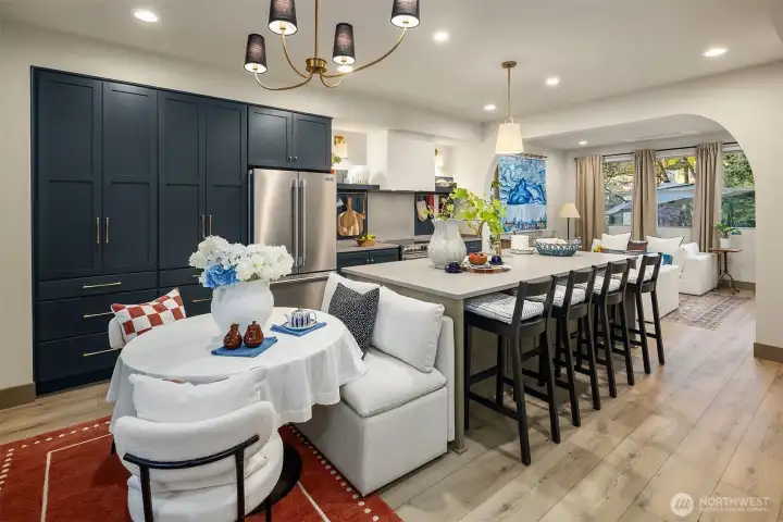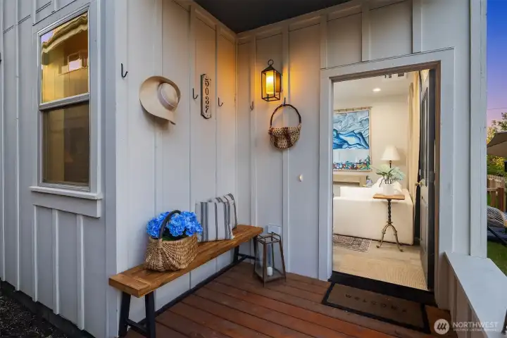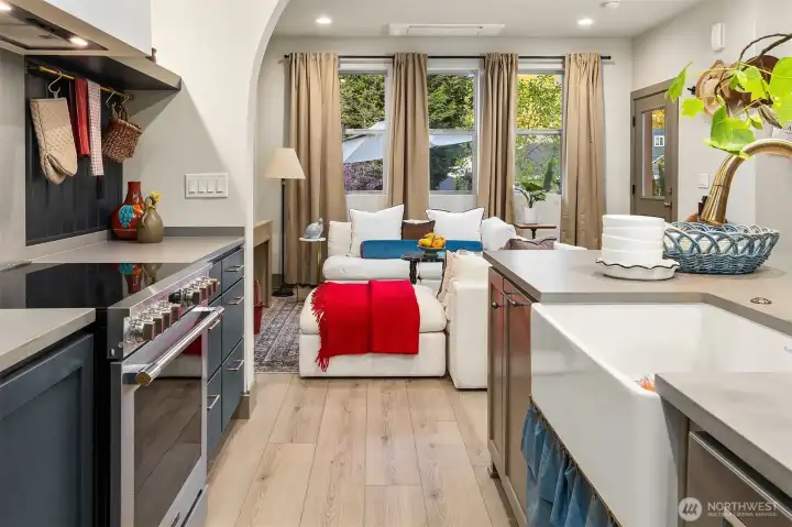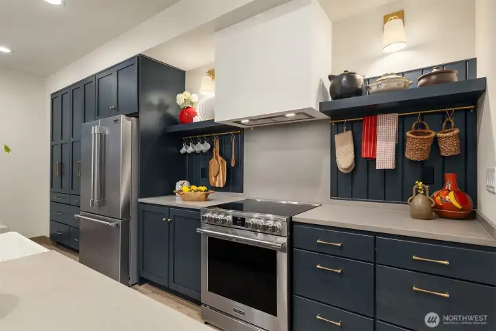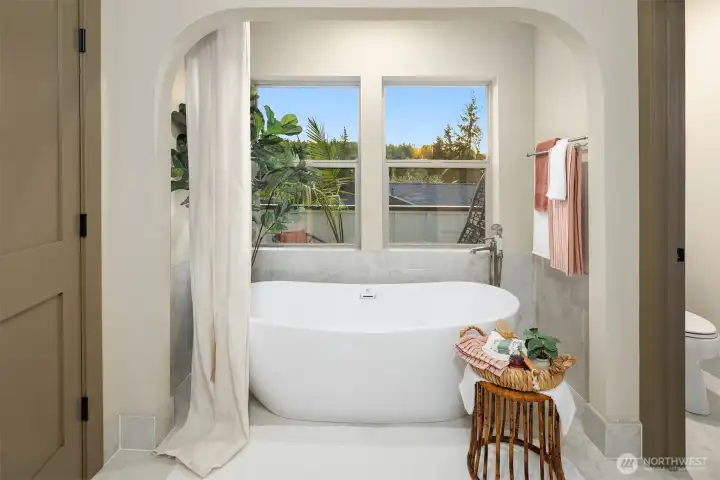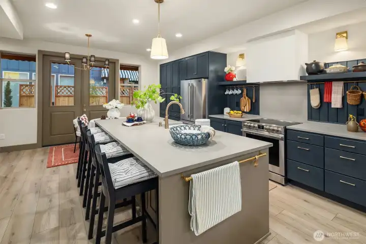 Designed for gathering and living beautifully, this Garden Terrace home unfolds into generous, light-filled spaces. The kitchen channels European countryside charm with navy alderwood cabinetry, brass rails imported from London, and classic fireclay apron sinks with timeless character. A cozy TV room offers the perfect setting for relaxed evenings, while a thoughtfully designed guest suite provides comfort and privacy for visitors. Upstairs, the primary suite feels like a private retreat, featuring a striking freestanding 70-inch soaking tub surrounded by floor-to-ceiling tile and brass accents for a spa-inspired experience. Cedar decks, hand-painted motifs, and curated lighting complete a setting where memories naturally take shape.
