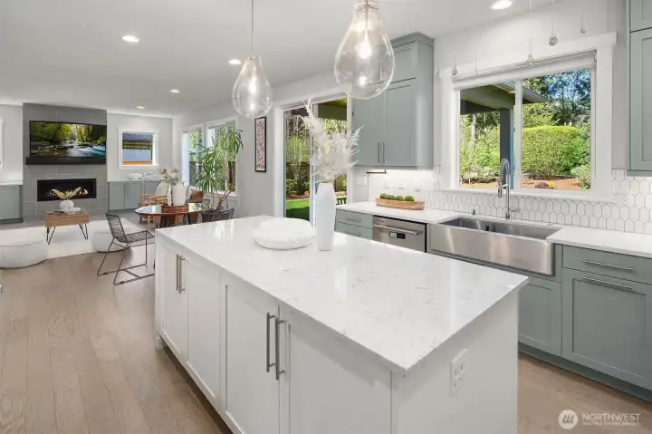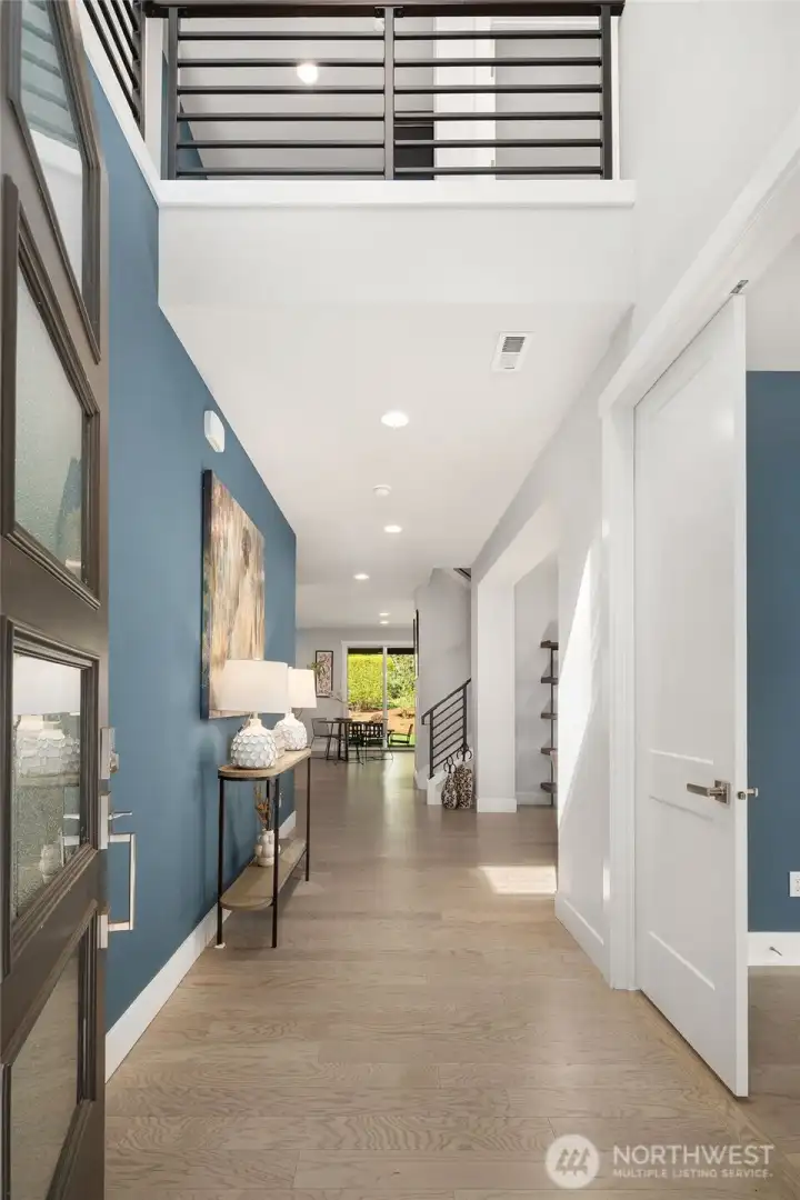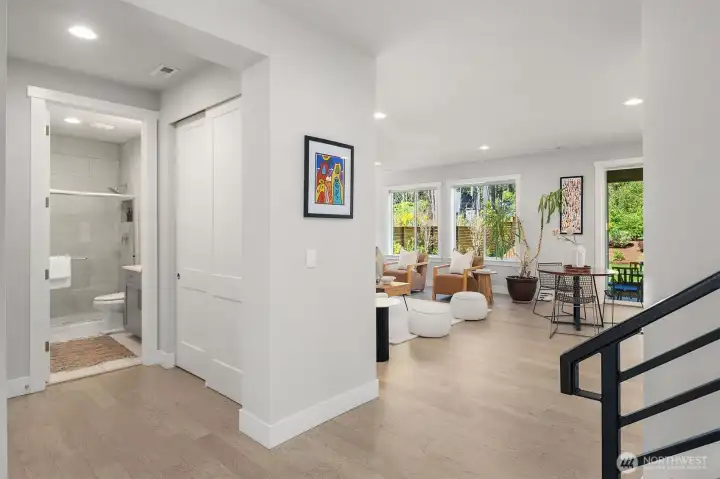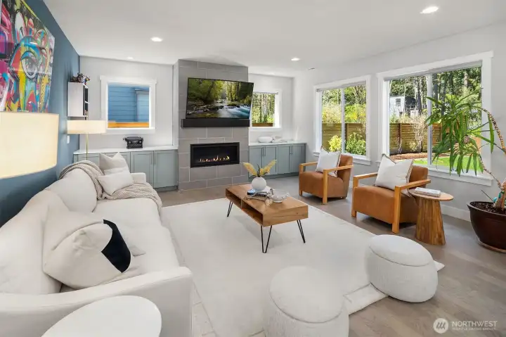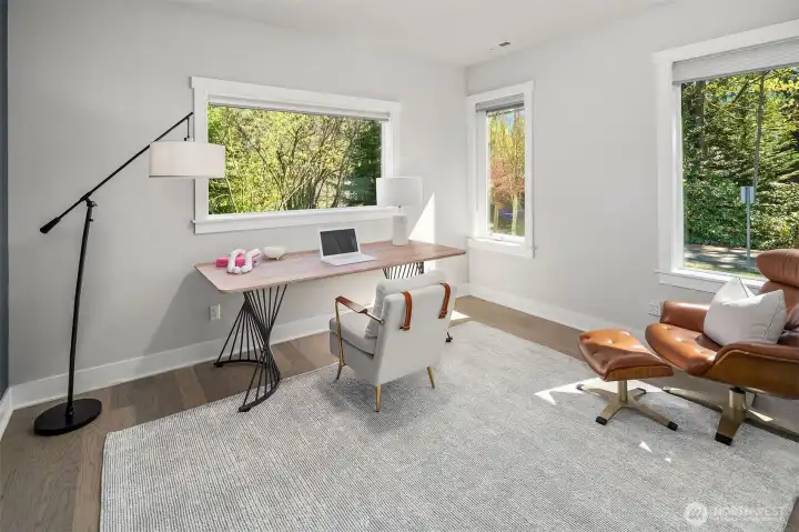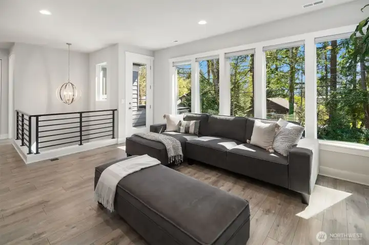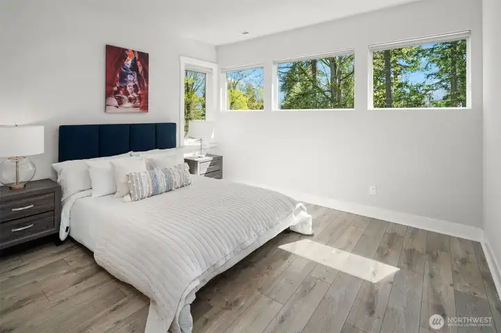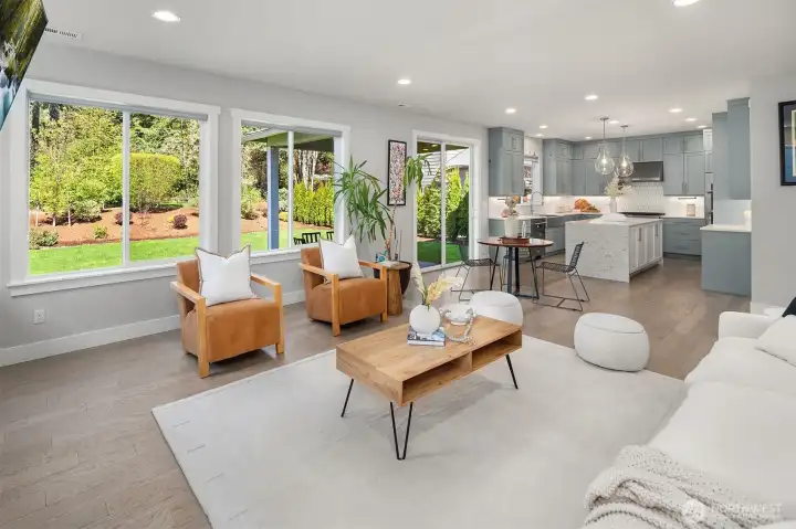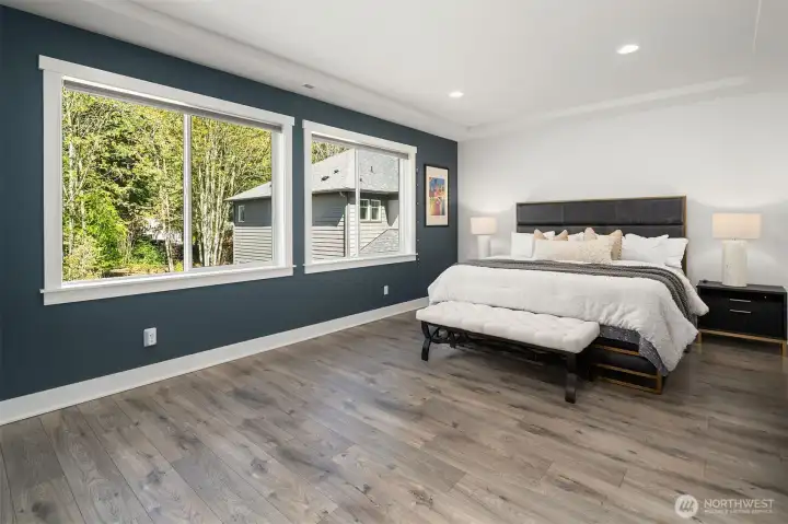 Welcome to this modern home built in 2021, situated in Finn Hill, Kirkland, near the desirable Juanita neighborhood. Set on nearly a 1/4-acre lot, this 5-bedroom, 2.75-bath residence has a bright and open design with 9-ft ceilings on both levels. Step inside to find a main-floor office that offers flexibility as a guest space or 5th bedroom, conveniently located next to a 3/4 bathroom. The home features engineered flooring throughout, an open-concept living room and kitchen, and plenty of thoughtful design details. The kitchen impresses with stunning quartz countertops, stainless steel appliances, light cabinetry, and a formal dining room complete with a butler's pantry. Upstairs, the primary suite offers a peaceful retreat with two walk-in closets and a spa-like bathroom overlooking a greenbelt. The upper level also includes three additional bedrooms, a spacious bonus room, a utility room, and a full bathroom. Additional features like A/C, an EV charger, an invisible fence and a large private level backyard with a covered patio, perfect for outdoor entertainment. Located on a quiet street with no HOA, close to parks and scenic trails.